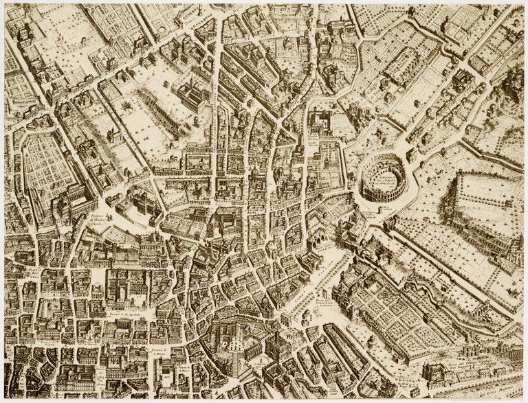 "CON TUTTE LE STRADE LE PIAZZE ET EDIFICII DE TEMPII PALAZZI GIARDINI ET ALTRE FABBRICHE ANTICHE E MODERNE COME SI TROVANO AL PRESENTE NEL PONTIFICATO DI N. S. PAPA INNOCENTIO XI. DISEGNIATA ET INTAGLIATA DA GIO. BATTISTA FALDA DA VALDUGGIA ET DATO AL PUBBLICO DA GIO. GIACOMO DE ROSSI DALLE SUE STAMPE IN ROMA ALLA PACE L' ANNO 1679. Riproduzione a cura della Biblioteca Vaticana (" Le Piante Maggiori di Roma dei secoli XVI e XVIII, riprodotte in fototipia a cura della Biblioteca Vaticana, in 12 fogli, tratta da l' originale pure in 12 fogli di cm.37x48. E' accompagnata da un testo illustrativo con ampie notizie su l' autore e il contenuto della pianta, le varie edizioni di essa, ecc., l' elenco dei nomi e la trascrizione delle leggende. La pianta è a proiezione verticale con elevazione. E' corredata da una cartina dell' agro romano e di vedute. "
