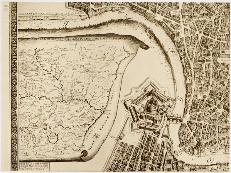"CON TUTTE LE STRADE LE PIAZZE ET EDIFICII DE TEMPII PALAZZI GIARDINI ET ALTRE FABBRICHE ANTICHE E MODERNE COME SI TROVANO AL PRESENTE NEL PONTIFICATO DI N. S. PAPA INNOCENTIO XI. DISEGNIATA ET INTAGLIATA DA GIO. BATTISTA FALDA DA VALDUGGIA ET DATO AL PUBBLICO DA GIO. GIACOMO DE ROSSI DALLE SUE STAMPE IN ROMA ALLA PACE L' ANNO 1679. Riproduzione a cura della Biblioteca Vaticana (" Le Piante Maggiori di Roma dei secoli XVI e XVIII, riprodotte in fototipia a cura della Biblioteca Vaticana, in 12 fogli, tratta da l' originale pure in 12 fogli di cm.37x48. E' accompagnata da un testo illustrativo con ampie notizie su l' autore e il contenuto della pianta, le varie edizioni di essa, ecc., l' elenco dei nomi e la trascrizione delle leggende. La pianta è a proiezione verticale con elevazione. E' corredata da una cartina dell' agro romano e di vedute. "