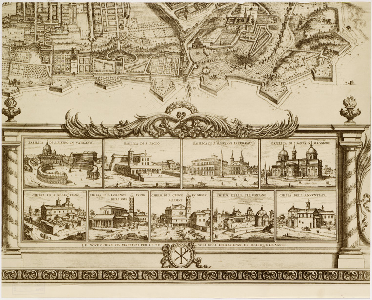 "CON TUTTE LE STRADE LE PIAZZE ET EDIFICII DE TEMPII PALAZZI GIARDINI ET ALTRE FABBRICHE ANTICHE E MODERNE COME SI TROVANO AL PRESENTE NEL PONTIFICATO DI N. S. PAPA INNOCENTIO XI. DISEGNIATA ET INTAGLIATA DA GIO. BATTISTA FALDA DA VALDUGGIA ET DATO AL PUBBLICO DA GIO. GIACOMO DE ROSSI DALLE SUE STAMPE IN ROMA ALLA PACE L' ANNO 1679. Riproduzione a cura della Biblioteca Vaticana (" Le Piante Maggiori di Roma dei secoli XVI e XVIII, riprodotte in fototipia a cura della Biblioteca Vaticana, in 12 fogli, tratta da l' originale pure in 12 fogli di cm.37x48. E' accompagnata da un testo illustrativo con ampie notizie su l' autore e il contenuto della pianta, le varie edizioni di essa, ecc., l' elenco dei nomi e la trascrizione delle leggende. La pianta è a proiezione verticale con elevazione. E' corredata da una cartina dell' agro romano e di vedute. "