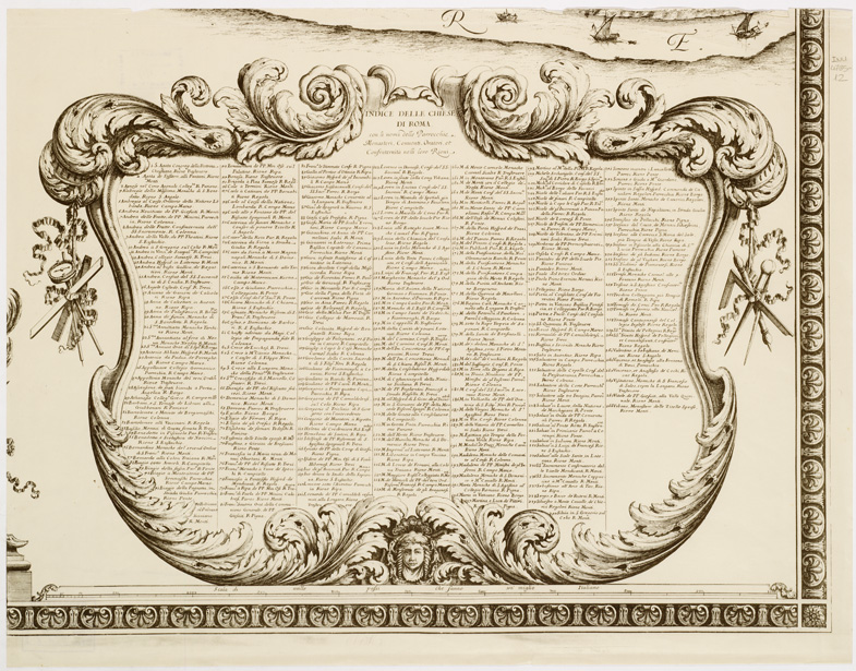 "CON TUTTE LE STRADE LE PIAZZE ET EDIFICII DE TEMPII PALAZZI GIARDINI ET ALTRE FABBRICHE ANTICHE E MODERNE COME SI TROVANO AL PRESENTE NEL PONTIFICATO DI N. S. PAPA INNOCENTIO XI. DISEGNIATA ET INTAGLIATA DA GIO. BATTISTA FALDA DA VALDUGGIA ET DATO AL PUBBLICO DA GIO. GIACOMO DE ROSSI DALLE SUE STAMPE IN ROMA ALLA PACE L' ANNO 1679. Riproduzione a cura della Biblioteca Vaticana (" Le Piante Maggiori di Roma dei secoli XVI e XVIII, riprodotte in fototipia a cura della Biblioteca Vaticana, in 12 fogli, tratta da l' originale pure in 12 fogli di cm.37x48. E' accompagnata da un testo illustrativo con ampie notizie su l' autore e il contenuto della pianta, le varie edizioni di essa, ecc., l' elenco dei nomi e la trascrizione delle leggende. La pianta è a proiezione verticale con elevazione. E' corredata da una cartina dell' agro romano e di vedute. "