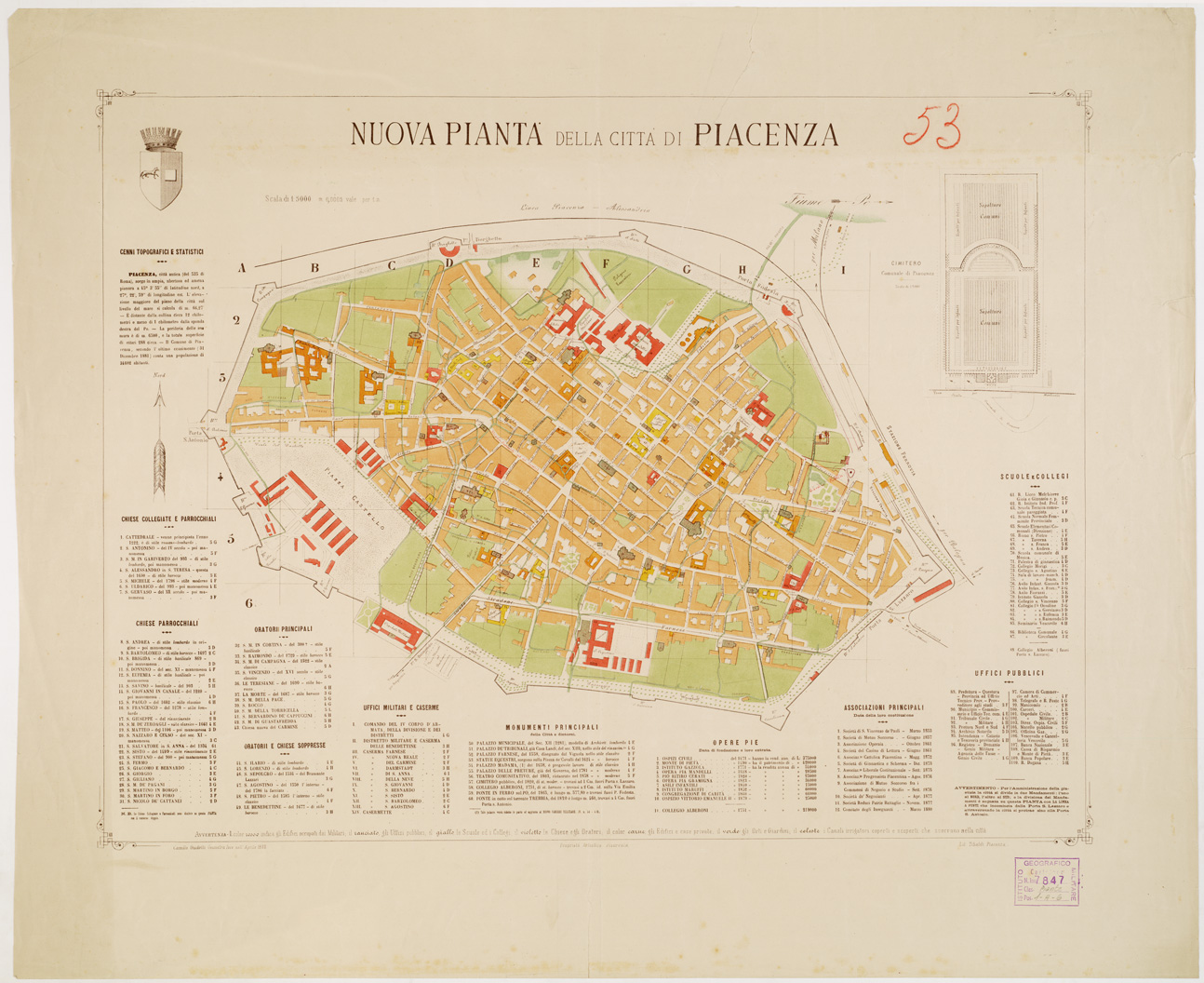 "Rappresentazione orografica planimetrica. La carta è corredata di un elenco di edifici pubblici e militari, monumenti, ecc... Ed. Lit. Tibaldi - Piacenza. Aut. C. Guidotti."