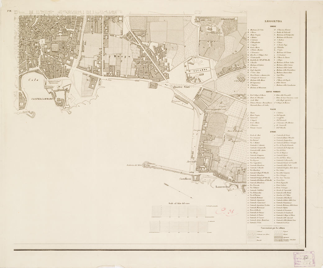 "Carta tratta da nitida incisione su rame, stampata in nero, in quattro fogli, ognuno delle dimensioni di m. 0,48x0,61, pubblicata dall'Officio Superiore dello Stato Maggiore, Sez. di Napoli, alla scala di 1:5.000. Sono distinte le varie colture. Ciascun foglio reca un elenco numerico delle principali costruzioni, strade e piazze. La scala grafica è calcolata in miglia geografiche, passi geodetici, chilometri e metri. Gli scandagli sono calcolati in metri. Al numero d' inventario 5114 sono archiviati i duplicati di questa carta. Confronta anche la stessa carta al numero d'inventario 1890 che porta la dicitura "Riconosciuta e rettificata nel 1873 "."