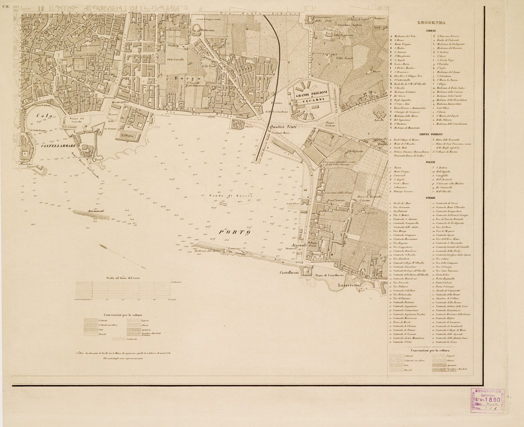 "Carta tratta da nitida incisione su rame, stampata in nero, in quattro fogli, ognuno delle dimensioni di m. 0,48x0,61, pubblicata dall'Officio Superiore dello Stato Maggiore, Sez. di Napoli, alla scala di 1:5.000. Sono distinte le varie colture. Ciascun foglio reca un elenco numerico delle principali costruzioni, strade e piazze. La scala grafica è calcolata in miglia geografiche, passi geodetici, chilometri e metri. Gli scandagli sono calcolati in metri. Al numero d' inventario 5114 sono archiviati i duplicati di questa carta. Confronta anche la stessa carta del 1864, documento n. 22."