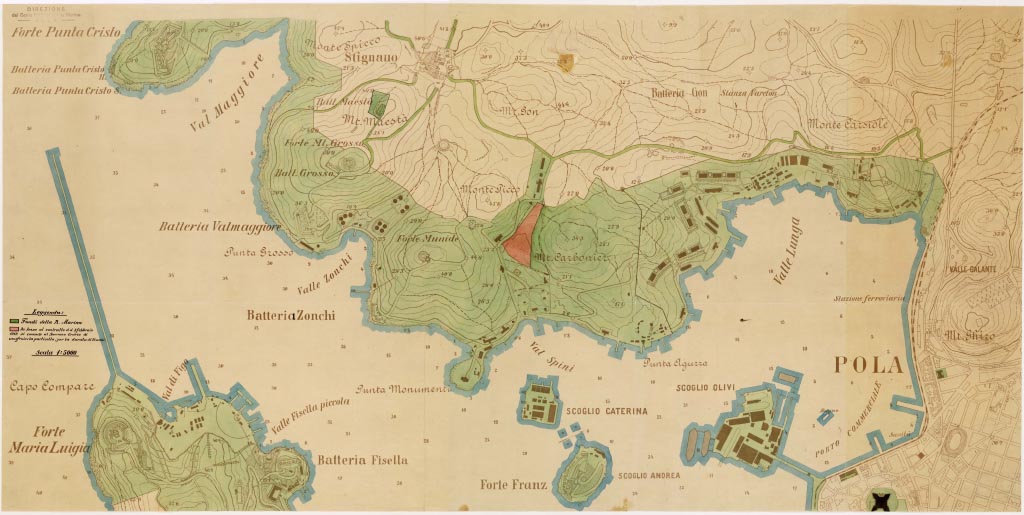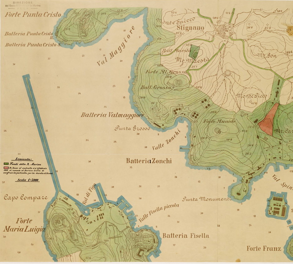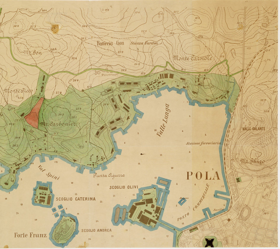 "Rappresentazione orografica planimetrica. La carta riporta un timbro della Direzione del Genio Militare per la Marina. Allo stesso numero d' inventario Carta di Pola in base al piano regolatore del 1912."