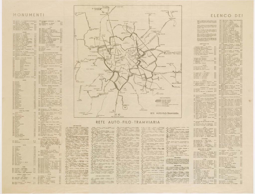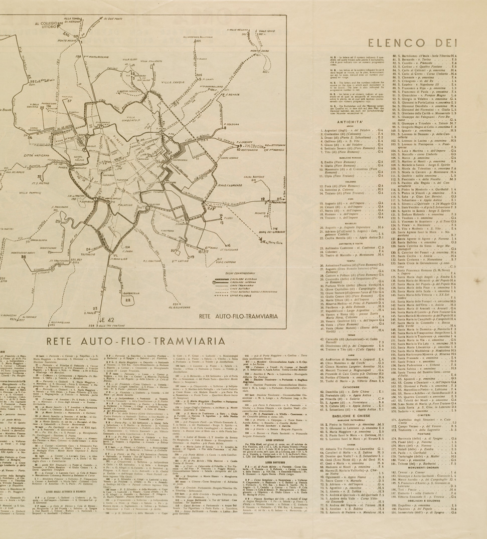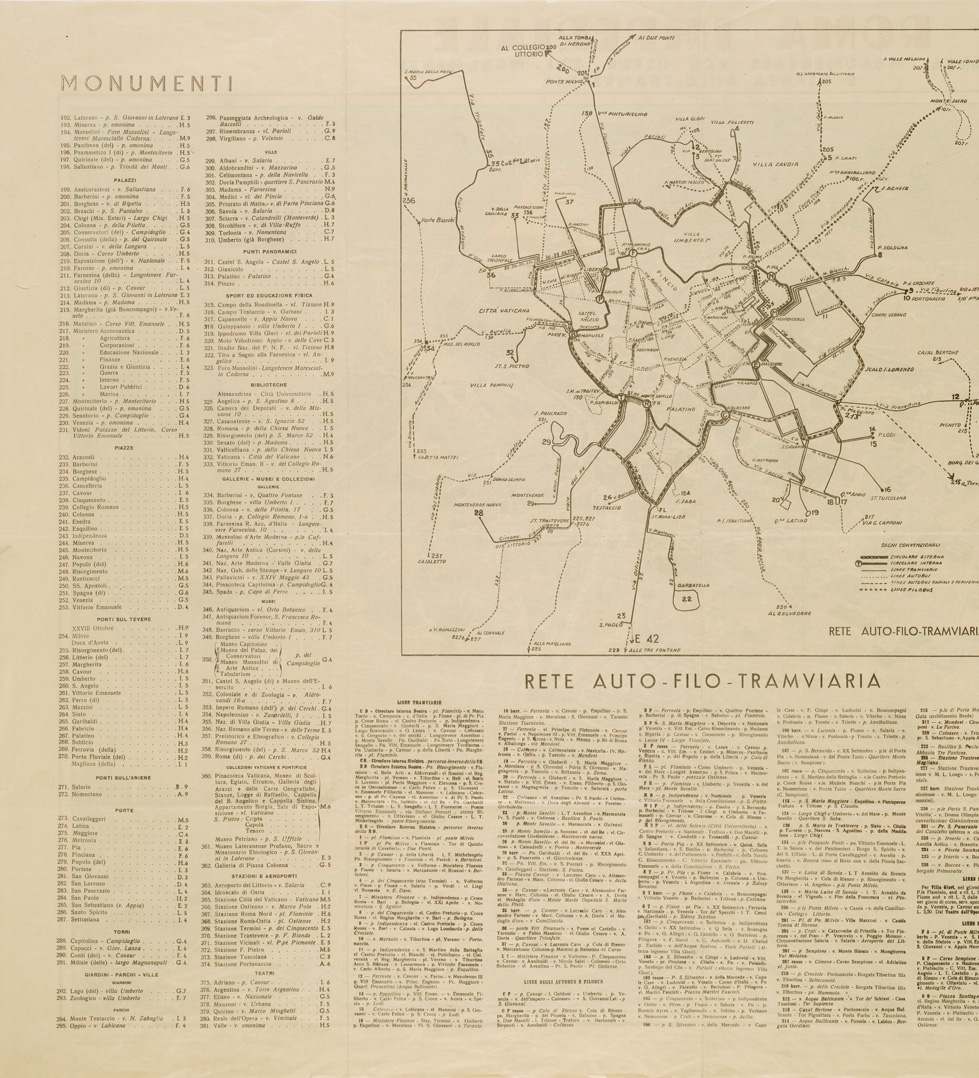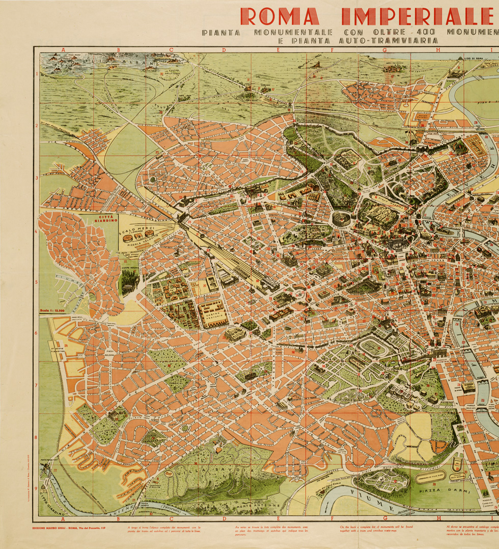 " Il documento comprende un fronte - la carta topografica - ed un retro con l'elenco dei monumenti. Rappresentazione orografica dimostrativa. Ed. Mauro Gigli- Roma."
