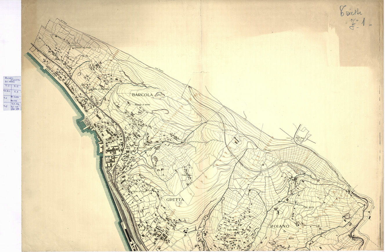 "Rappresemtazione orografica a curve di livello. Ufficio tecnico comunale, Trieste. Stab. Tipo -Litografico G. Chiesa, Udine. E' annesso un piccolo quadro d'unione. La stessa carta è al numero d'inventario 7197."