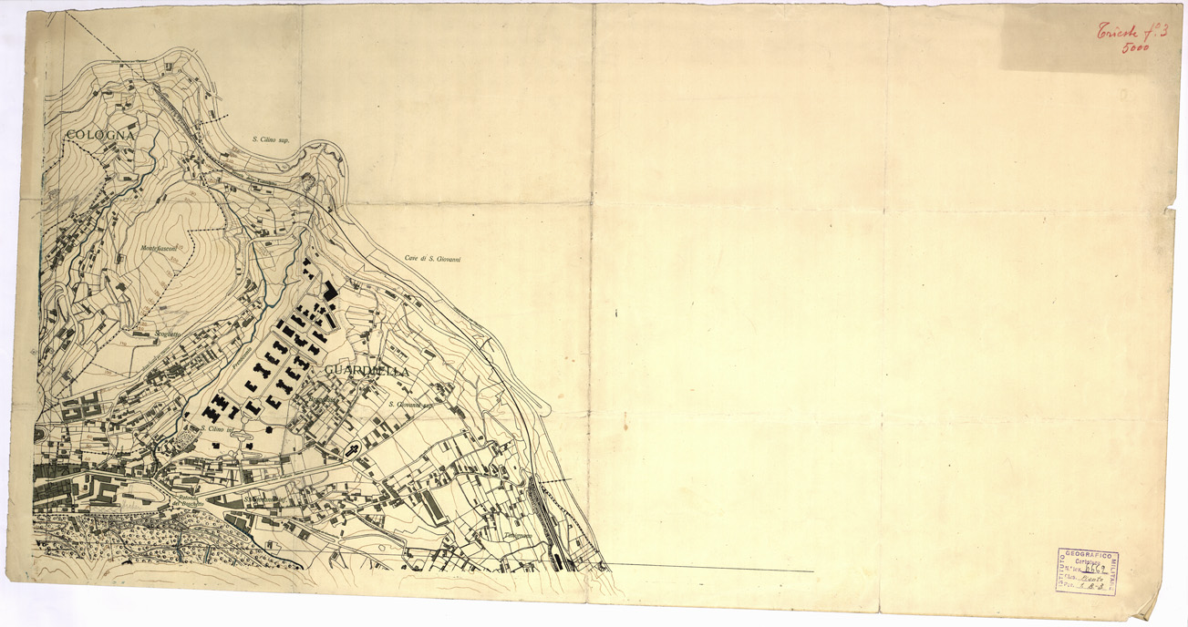 "Rappresemtazione orografica a curve di livello. Ufficio tecnico comunale, Trieste. Stab. Tipo -Litografico G. Chiesa, Udine. La stessa carta è al numero d'inventario 7197."