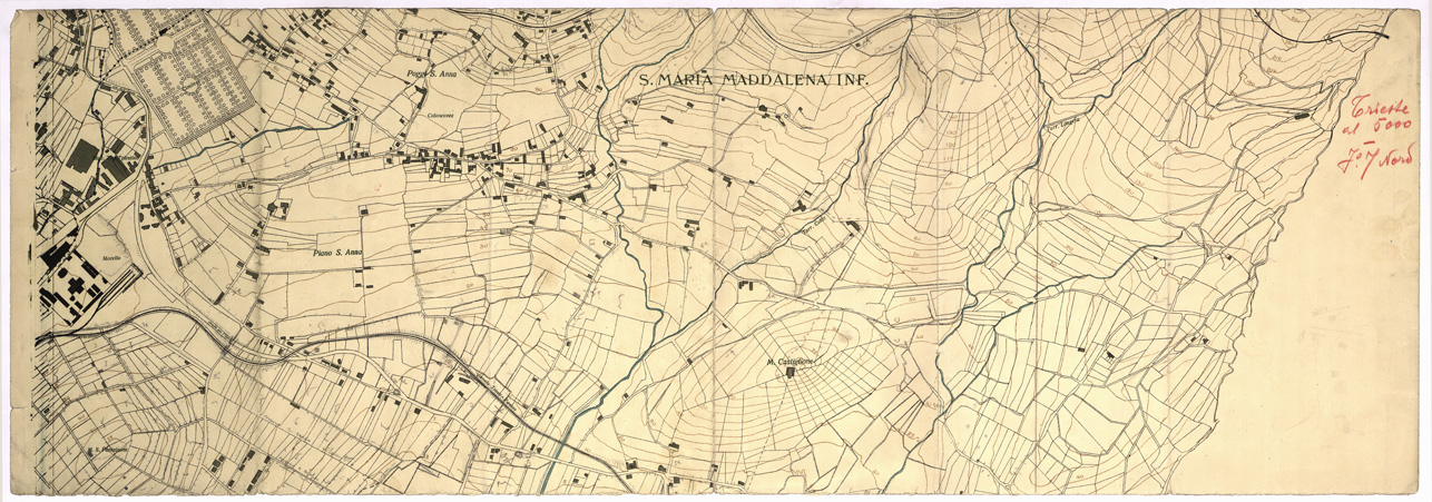 "Rappresemtazione orografica a curve di livello. Ufficio tecnico comunale, Trieste. Stab. Tipo -Litografico G. Chiesa, Udine. La stessa carta è al numero d'inventario 7197."