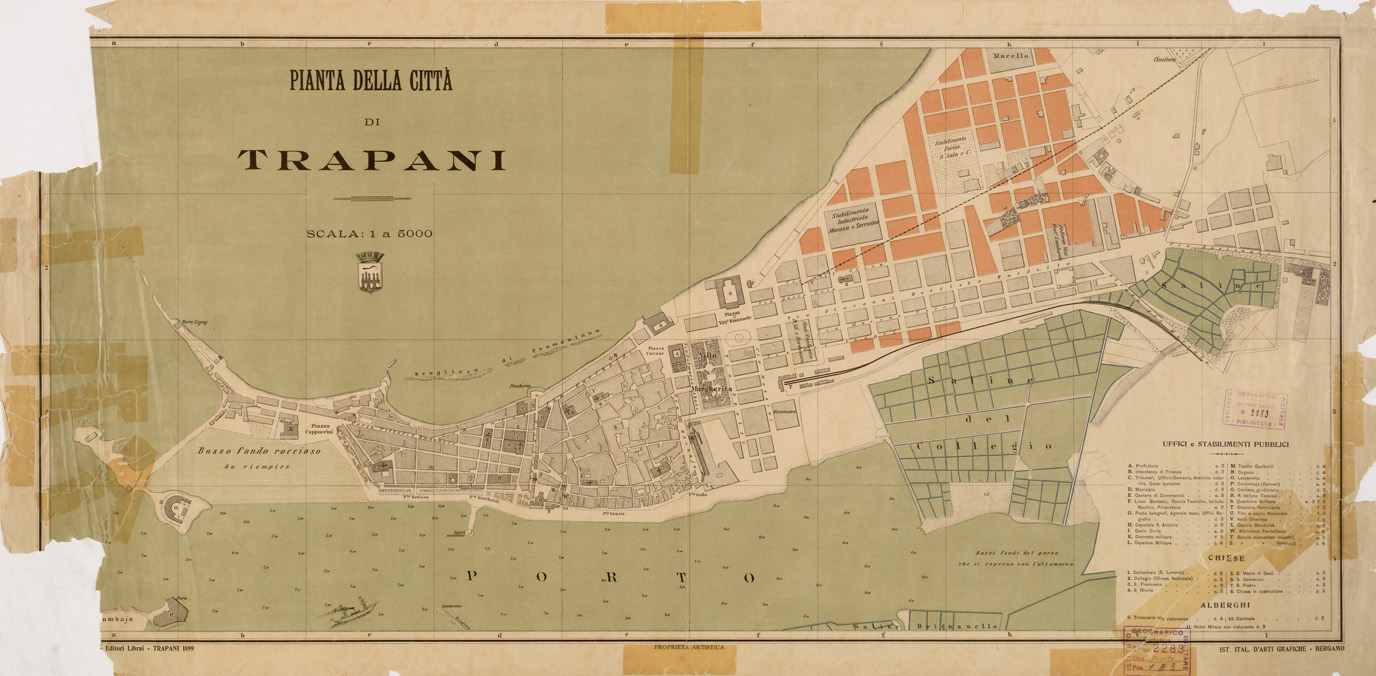 "B. MANNONE EDITORI LIBRAI. TRAPANI. IST. ITAL. D'ARTI GRAFICHE. BERGAMO. Un foglio a colori. In basso a destra elenco alfabetico- numerico degli edifici principali."