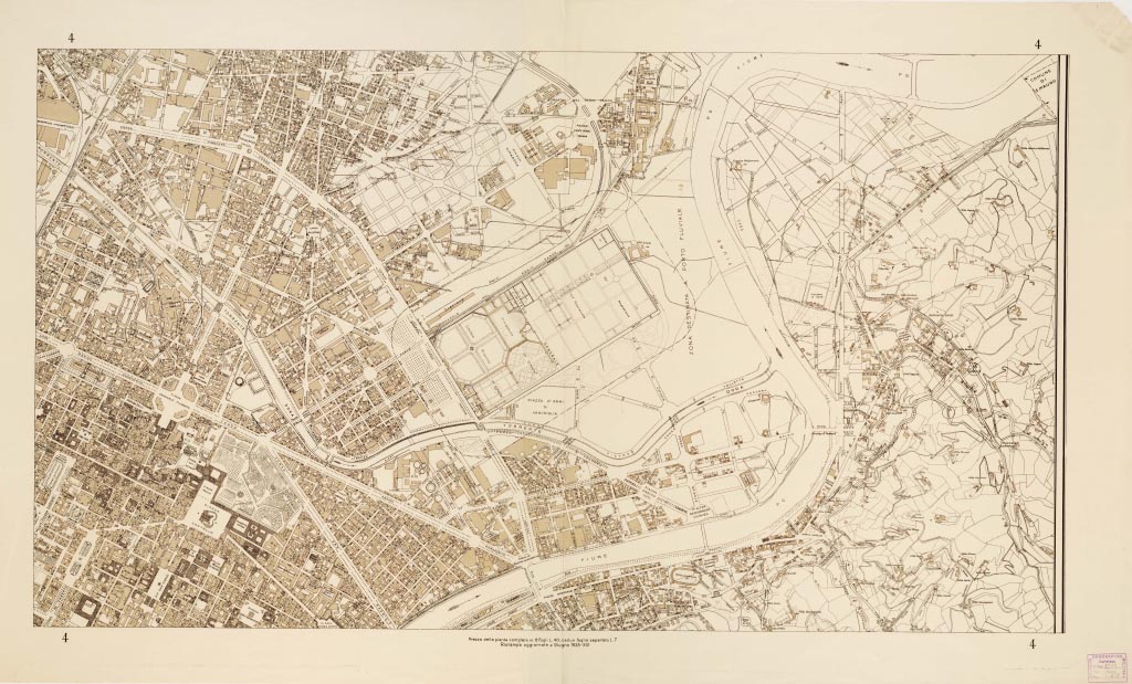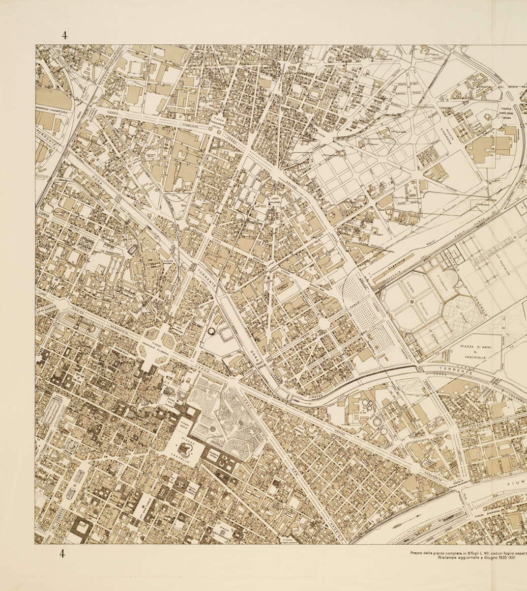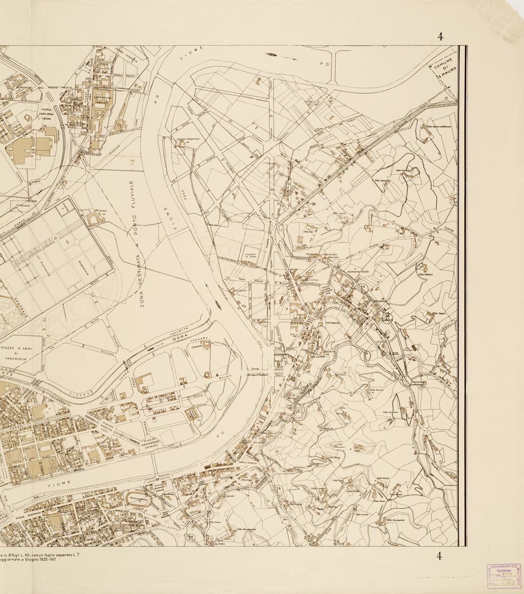 "COLL´INDICAZIONE DEI DUE PIANI REGOLATORI E DI AMPLIAMENTO RISPETTIVAMENTE DELLA ZONA PIANA (VIGENTE PER LEGGE 5 APRILE 1908 E R. DECRETO 15 GENNAIO 1920) E DELLA ZONA COLLINARE (VIGENTE PER DECRETO LUOG. 10 MARZO 1918) AGGIORNATI COLLE VARIANTI DELIBERATE SUCCESSIVAMENTE SINO A GIUGNO 1935 - XIII. COMPILATA DAL SERVIZIO TECNICO MUNICIPALE DEI LAVORI PUBBLICI. Carta composta da 8 fogli più il quadro d'unione. Nel foglio n. 8 vi sono i segni convenzionali. Rappresentazione orografica planimetrica. S. A. Lit. Doyen-Marchisio, Torino."