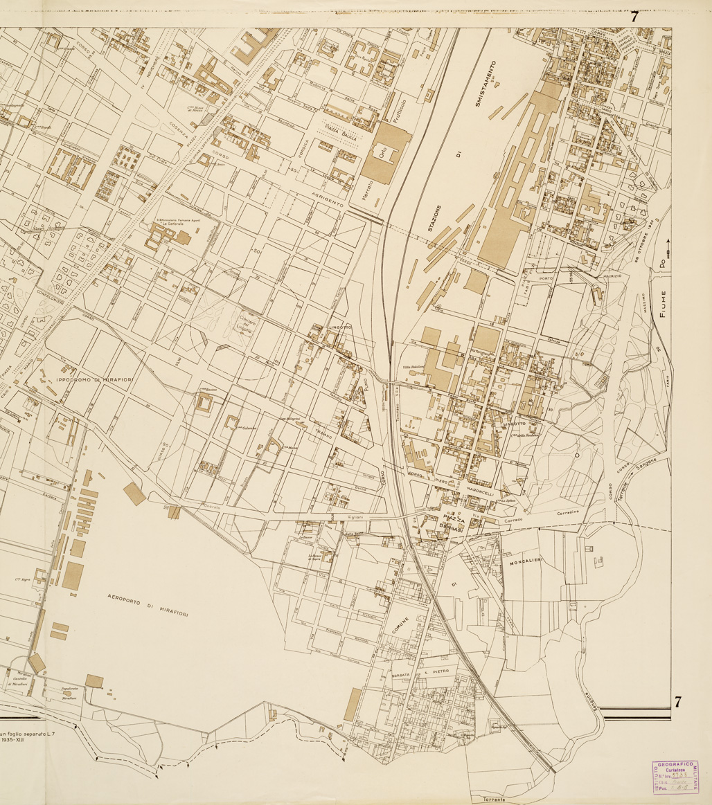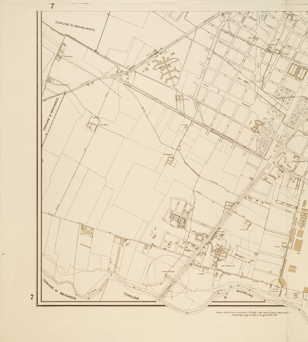 "COLL´INDICAZIONE DEI DUE PIANI REGOLATORI E DI AMPLIAMENTO RISPETTIVAMENTE DELLA ZONA PIANA (VIGENTE PER LEGGE 5 APRILE 1908 E R. DECRETO 15 GENNAIO 1920) E DELLA ZONA COLLINARE (VIGENTE PER DECRETO LUOG. 10 MARZO 1918) AGGIORNATI COLLE VARIANTI DELIBERATE SUCCESSIVAMENTE SINO A GIUGNO 1935 - XIII. COMPILATA DAL SERVIZIO TECNICO MUNICIPALE DEI LAVORI PUBBLICI. Carta composta da 8 fogli più il quadro d'unione. Nel foglio n. 8 vi sono i segni convenzionali. Rappresentazione orografica planimetrica. S. A. Lit. Doyen-Marchisio, Torino."
