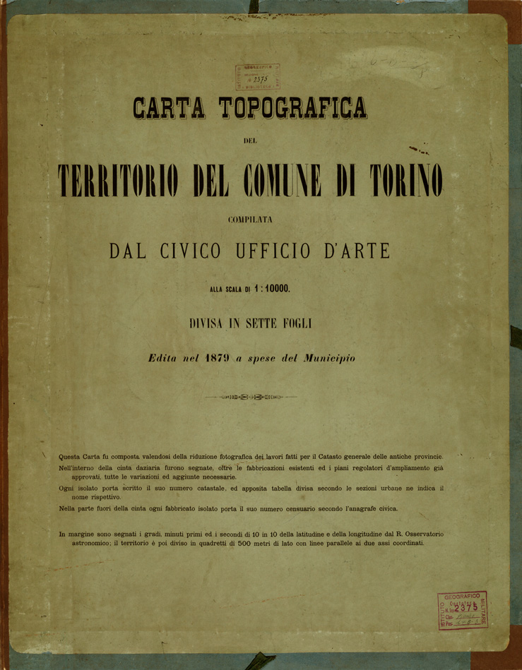 "...COMPILATA DAL CIVICO UFFICIO D'ARTE ALLA SCALA DI 1:10.000 DIVISA IN SETTE FOGLI EDITA NEL 1879 A SPESE DEL MUNICIPIO. Questa Carta fu composta valendosi della riduzione fotografica dei lavori fatti per il Catasto generale delle antiche provincie. Nell'interno della cinta daziaria furono segnate, oltre le fabbricazioni esistenti ed i piani regolatori d'ampliamento già approvati tutte le variazioni ed aggiunte necessarie. Ogni isolato porta scritto il suo numero catastale, ed apposita tabella divisa secondo le sezioni urbane ne indica il nome rispettivo. Nella parte fuori della cinta ogni fabbricato isolato porta il suo numero censuario secondo l'anagrafe civica. In margine sono segnati i gradi, minuti primi ed i secondi di 10 in 10 della latitudine e della longitudine dal R. Osservatorio astronomico il territorio è poi diviso in quadretti di 500 metri di lato con linee parallele ai due assi coordinati. Civico Ufficio d'Arte del Comune di Torino. "