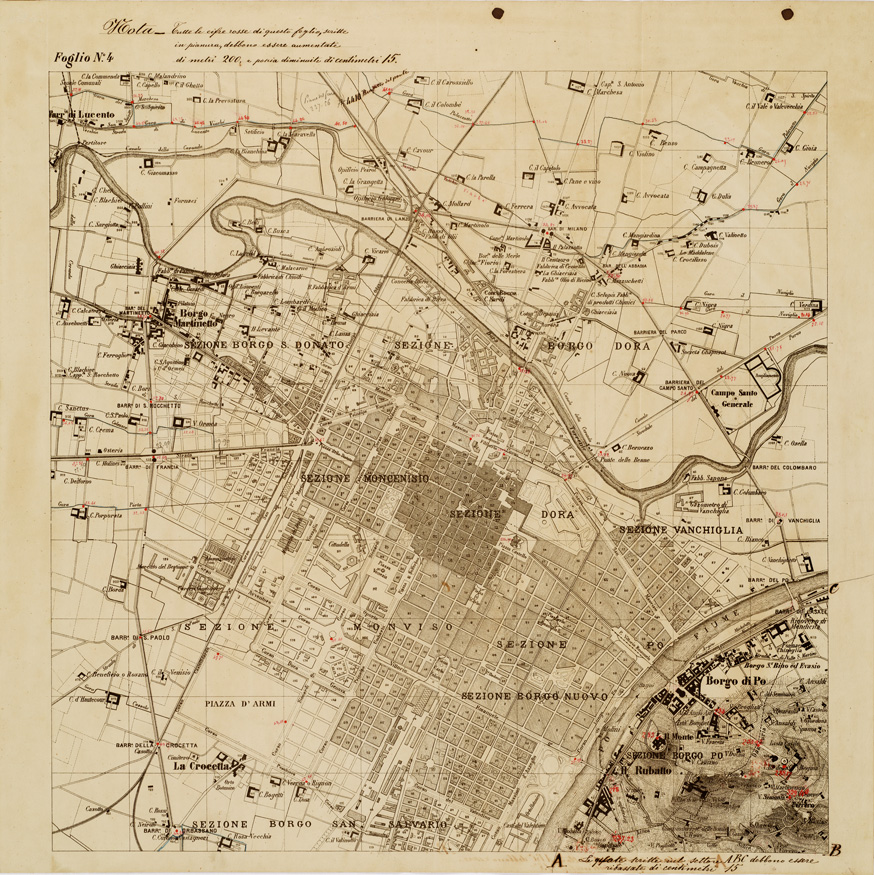"...COMPILATA DAL CIVICO UFFICIO D'ARTE ALLA SCALA DI 1:10.000 DIVISA IN SETTE FOGLI EDITA NEL 1879 A SPESE DEL MUNICIPIO. Questa Carta fu composta valendosi della riduzione fotografica dei lavori fatti per il Catasto generale delle antiche provincie. Nell'interno della cinta daziaria furono segnate, oltre le fabbricazioni esistenti ed i piani regolatori d'ampliamento già approvati tutte le variazioni ed aggiunte necessarie. Ogni isolato porta scritto il suo numero catastale, ed apposita tabella divisa secondo le sezioni urbane ne indica il nome rispettivo. Nella parte fuori della cinta ogni fabbricato isolato porta il suo numero censuario secondo l'anagrafe civica. In margine sono segnati i gradi, minuti primi ed i secondi di 10 in 10 della latitudine e della longitudine dal R. Osservatorio astronomico il territorio è poi diviso in quadretti di 500 metri di lato con linee parallele ai due assi coordinati. Civico Ufficio d'Arte del Comune di Torino."