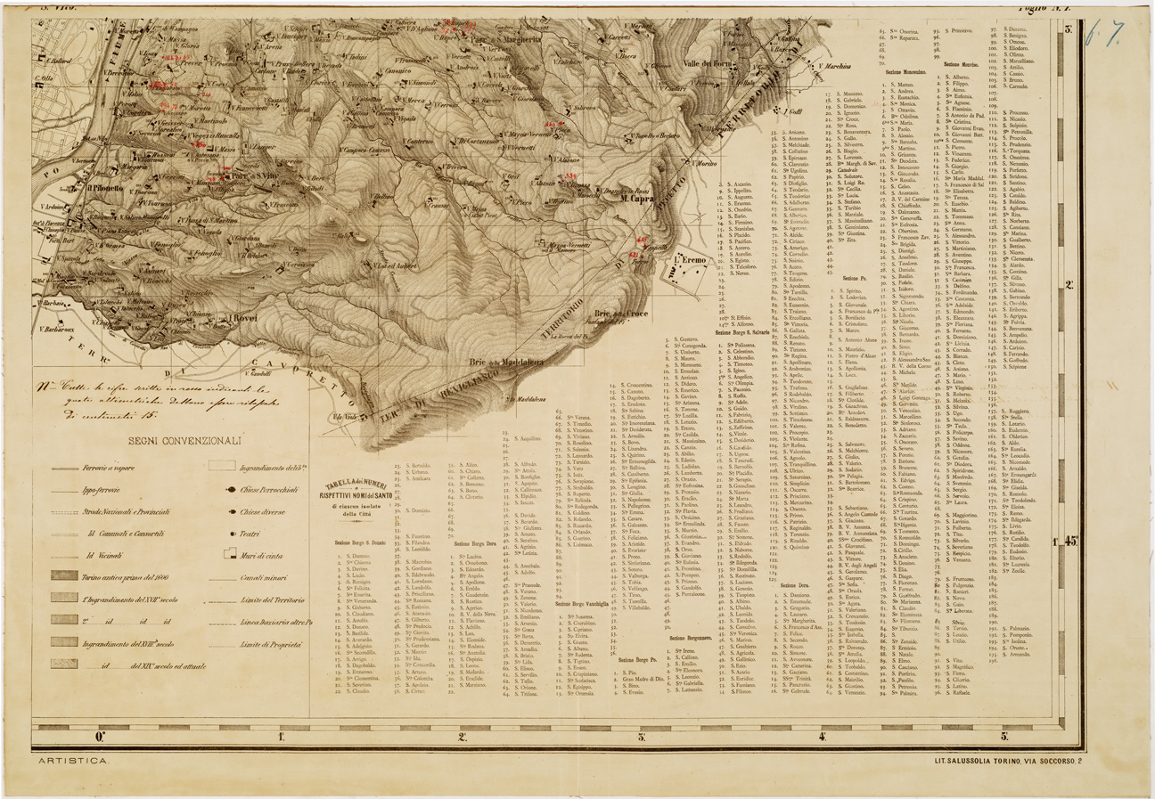 "...COMPILATA DAL CIVICO UFFICIO D'ARTE ALLA SCALA DI 1:10.000 DIVISA IN SETTE FOGLI EDITA NEL 1879 A SPESE DEL MUNICIPIO. Questa Carta fu composta valendosi della riduzione fotografica dei lavori fatti per il Catasto generale delle antiche provincie. Nell'interno della cinta daziaria furono segnate, oltre le fabbricazioni esistenti ed i piani regolatori d'ampliamento già approvati tutte le variazioni ed aggiunte necessarie. Ogni isolato porta scritto il suo numero catastale, ed apposita tabella divisa secondo le sezioni urbane ne indica il nome rispettivo. Nella parte fuori della cinta ogni fabbricato isolato porta il suo numero censuario secondo l'anagrafe civica. In margine sono segnati i gradi, minuti primi ed i secondi di 10 in 10 della latitudine e della longitudine dal R. Osservatorio astronomico il territorio è poi diviso in quadretti di 500 metri di lato con linee parallele ai due assi coordinati. Civico Ufficio d'Arte del Comune di Torino."