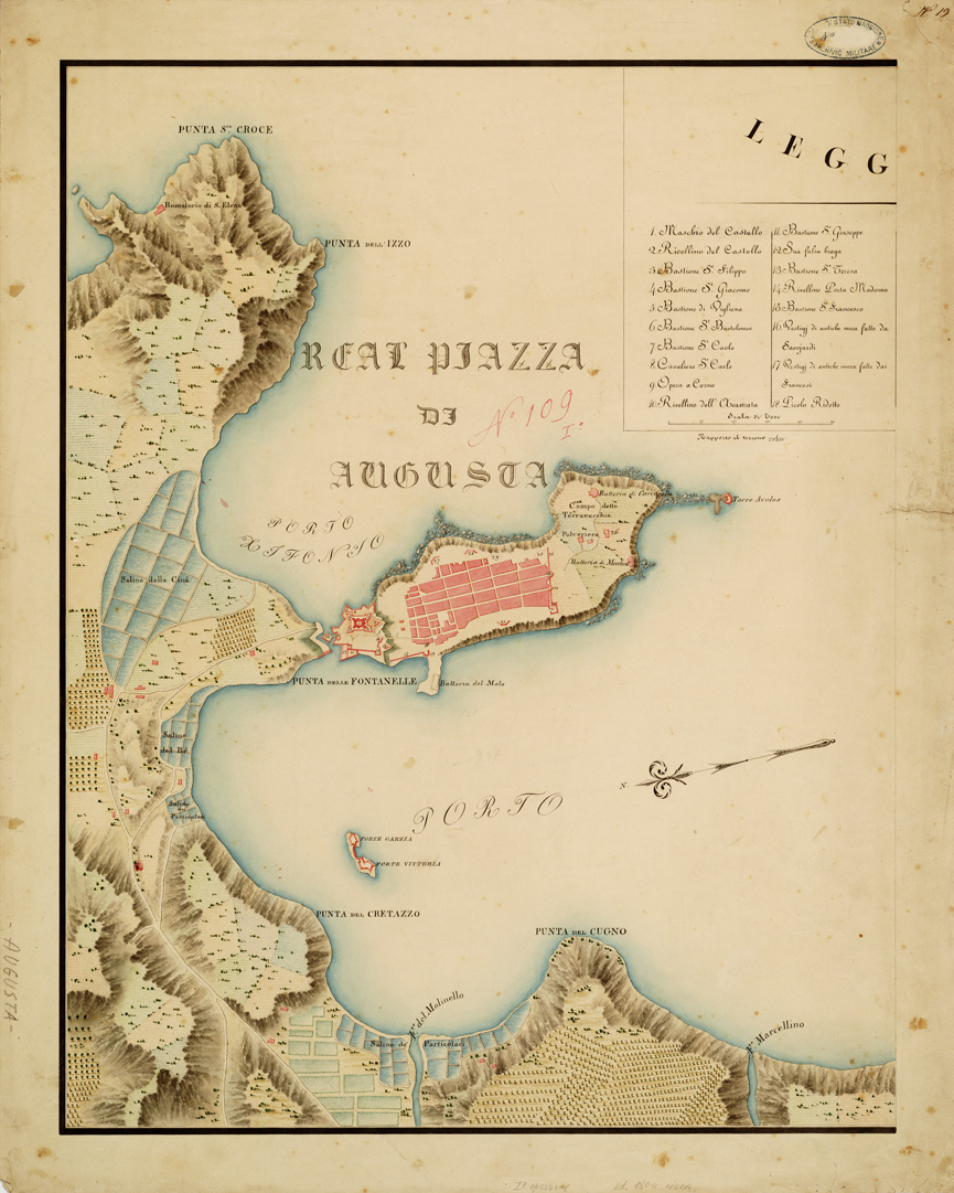 AUGUSTA REAL PIAZZA DI AUGUSTA E LE SUE FORTIFICAZIONI CON LEGENDA AL CENTRO - Foglio 1