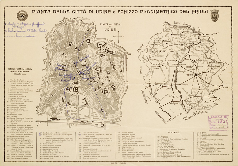 "Rappresentazione orografica planimetrica. A sinistra ed in basso l'elenco degli: Edifici pubblici, Istituti, Sedi di Enti morali, Scuole e Chiese. Tipografia F.lli Tosolini, Udine."