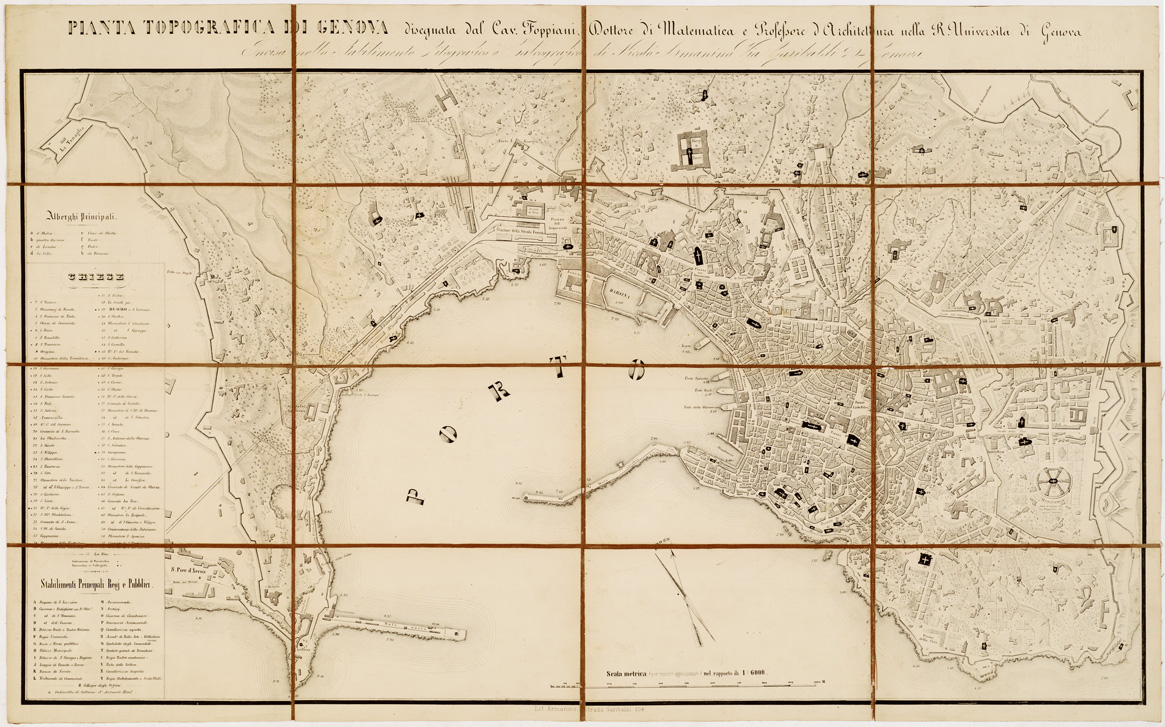PIANTA TOPOGRAFICA DI GENOVA DISEGNATA DAL CAV. FOPPIANI, DOTTORE DI MATEMATICA E PROFESSORE D'ARCHITETTURA NELLA R. UNIVERSITA' DI GENOVA. INCISA NELLO STABILIMENTO LITOGRAFICO E CALCOGRAFICO DI NICOLO' ARMANINO