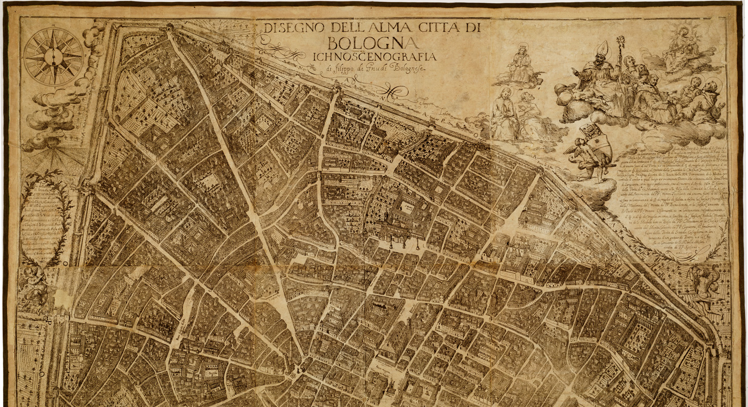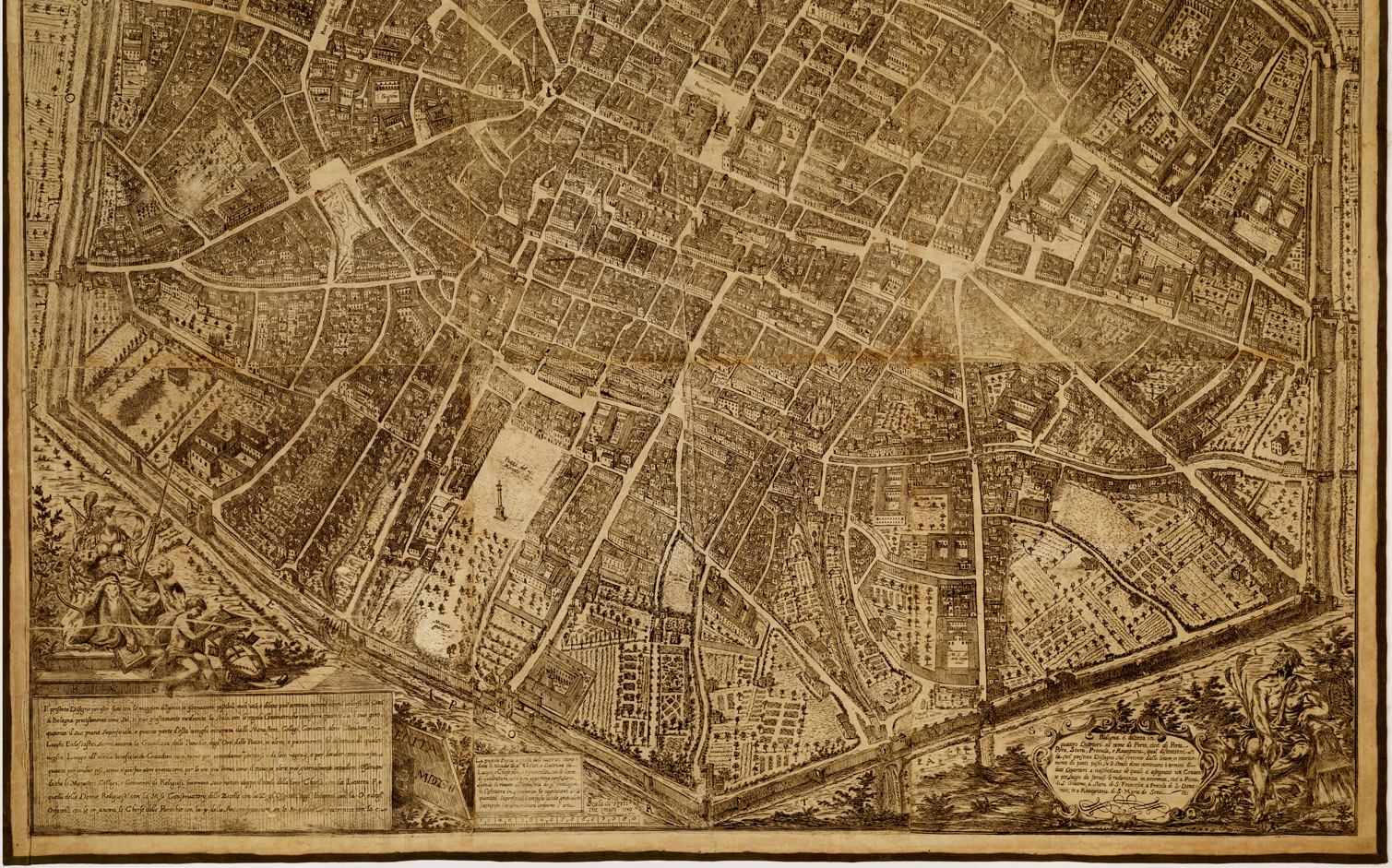 "Pianta prospettica in 9 fogli incisi su rame riuniti e montati su tela. E' orientata col nord spostato in basso. Vi sono inserite notizie su le chiese e i conventi, ecc. Scala grafica in pertiche bolognesi."