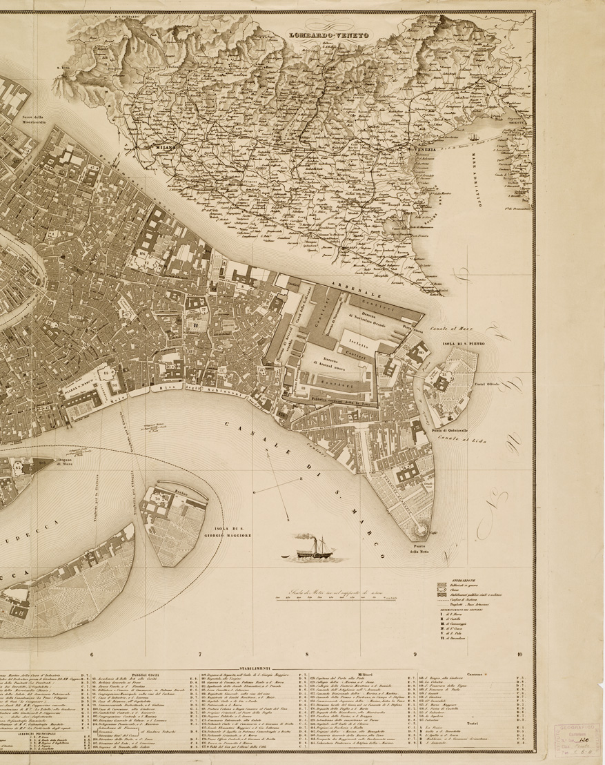 "La stessa carta al numero d'inventario 120 che ha come didascalia: "un foglio tratto da incisione su rame montato su tela a stacchi stampato in nero per le costruzioni civili e militari, rosso per gli edifici religiosi, azzurro per le acque. Sono indicati giardini, orti, confini di sestieri, traghetti, pozzi artesiani, ecc. In alto a destra una cartina parziale del Lombardo-Veneto: in basso a sinistra una cartina della Laguna Veneta. La carta è sussidiata di elenco alfabetico numerico delle principali costruzioni religiose, civili e militari"."