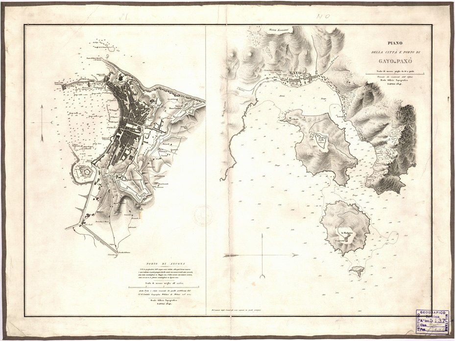 "I Rappresentazione orografica a tratteggio. Le profondità dell'acqua sono ridotte alla più bassa marea e sono indicate in piedi parigini. Quelle notate con numeri tondi sono state scandagliate in Maggio 1811, e l'altre notate con numeri corsivi furono scandagliate in Agosto 1800. Detto Porto è stato ricavato da quello pubblicato dall'I. R. I.G.M. di Milano nel 1824. Reale Officio Topografico Napoli, 1841. II Rappresentazione orografica a tratteggio scala di mezzo miglio da 60 a grado. I numeri degli Scandagli sono espressi in piedi parigini. Ricavato da materiali dell'Officio. Reale Officio Topografico Napoli, 1841."