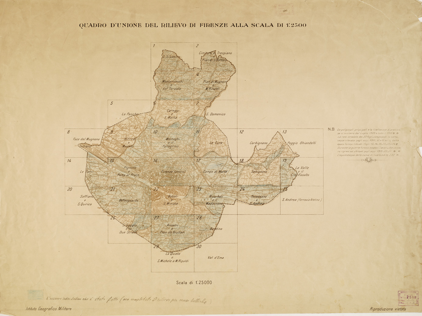 "ALLA SCALA DI 1:2.500. MUNICIPIO DI FIRENZE, 1910-14. RILIEVO TACHEOMETRICO DELL' I.G.M. PIANO REGOLATORE DI AMPLIAMENTO DELL' UFFICIO TECNICO MUNICIPALE. Carta in 30 fogli, con orografia a curve di livello, acque in azzurro, costruzioni riempite in grigio. Annesso il quadro d' unione."
