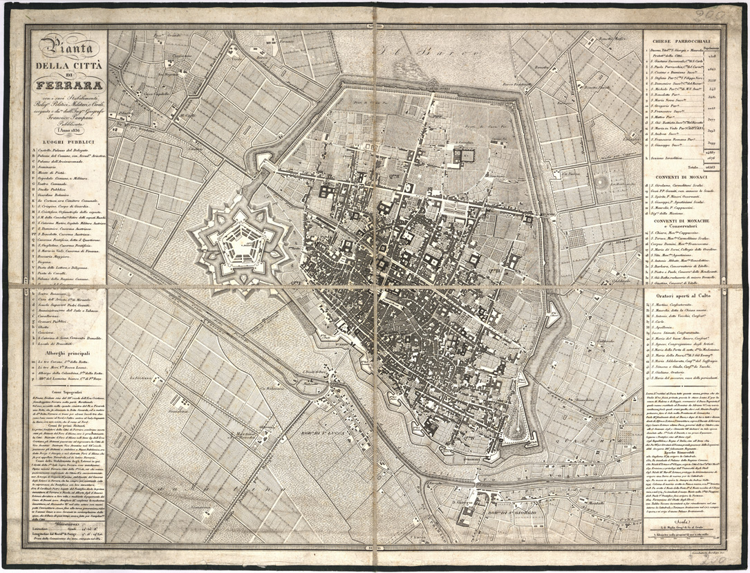 "...CON I SUOI STABILIMENTI RELIGIOSI, POLITICI, MILITARI E CIVILI, ESEGUITA E DIS.TA DALL'ING.RE GEOGRAFO FRANCESCO PAMPANI PUBBLICATA L'ANNO 1836. Foglio unico montato su tela a stacchi. Incisione su rame di Giamb. Bordiga. E' sussidiata da elenco numerico degli edifici principali, cenni topografici, e cenni storici. Due scale grafiche in miglia di 60 al grado e in chilometri."