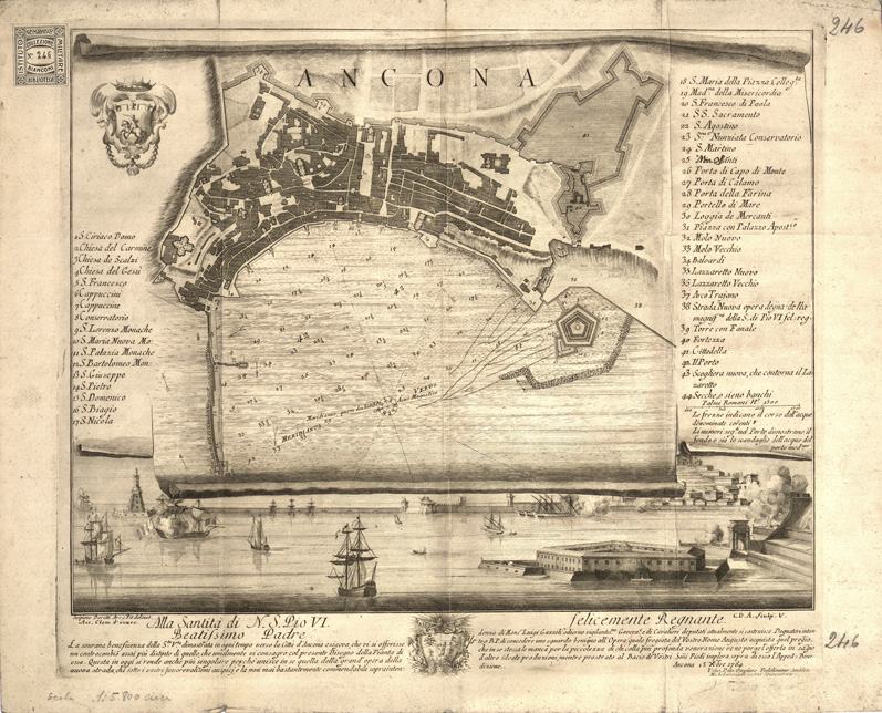 "Pianta di Ancona. Foglio unico inciso su rame. Orientazione: il nord è rivolto verso l'angolo in basso a sinistra. A destra e a sinistra elenco numerico delle principali costruzioni. In basso la dedica a Pio VI firmata Michelangelo Sartori, Stampatore, e una veduta del porto."