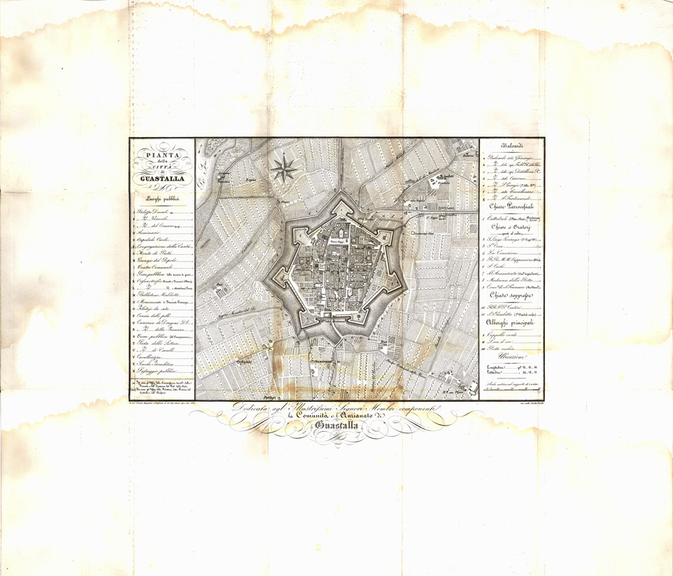 "Un foglio tratto da nitida incisione su rame, piegato e contenuto in libretto. Stampa in nero. In basso trovasi la dedica "Agli Illustrissimi Signori Membri componenti la Comunità e l'Anzianato di Guastalla" e le due seguenti indicazioni: "E. Azzi, Tenente Mappatore e Professore di dis. Top. ridusse rip. e dis. 1832" "Inc. nello Studio Toschi". La pianta è sussidiata da elenco alfabetico delle costruzioni principali. Scala grafica in metri. "