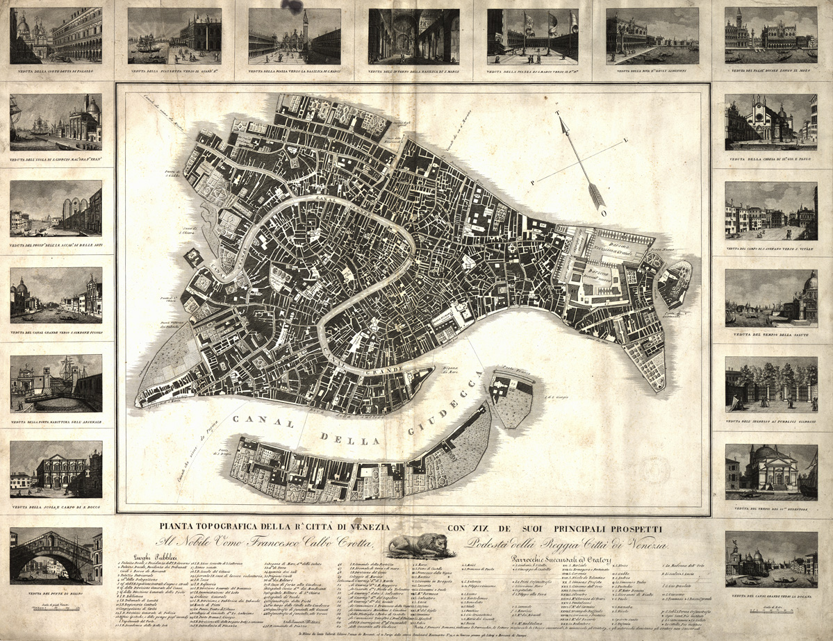 "...CON XIX DE SUOI PRINCIPALI PROSPETTI. AL NOBILE UOMO FRANCESCO CALBO GROTTA PODESTA' DELLA REGGIA CITTA' DI VENEZIA. Incisione su rame. Rappresentazione orografica planimetrica. In basso sotto al titolo l'elenco dei luoghi pubblici parrocchie succursali ed oratori. Intorno alla carta i prospetti principali di Venezia. In Milano e Parigi da Santo Vallardi Editore, in Venezia presso i Librai e Mercanti di Stampe. Due scale grafiche: una di piedi Veneti e una di Metri."