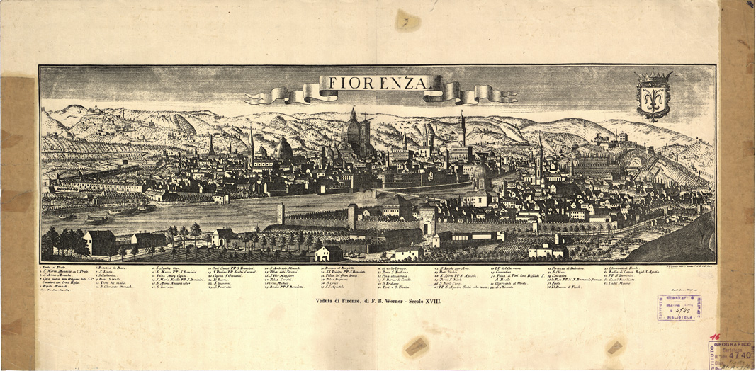 "Veduta prospettica di F. B. Werner. Riproduzione fotografica annessa allo scritto di Ciullini R., " Di una raccolta di antiche carte e vedute della città di Firenze ", ne " L' universo ", 1924. (Cfr. Mori A. e Boffito G., " Firenze nelle vedute e piante ", 1926, pagg. 72-73)."