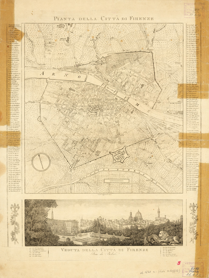 "Incisione su rame. Rappresentazione orografica planimetrica. Ai lati della carta i "Nomi delle Strade a Mezzogiorno d'Arno". In basso la "VEDUTA DELLA CITTA' DI FIRENZE PRESE DA BOBOLI". A. Coppiardi incise, G. Canacci disegnò."
