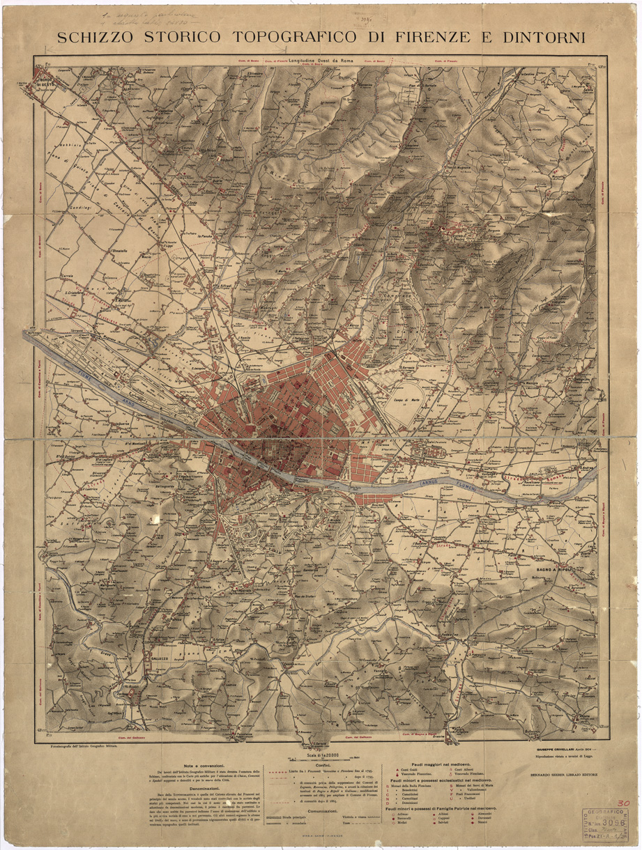 "...G. CRIVELLARI. I.G.M. Fotozincografia a colori basata sui rilievi eseguiti dall' I.G.M. con aggiunta l' ubicazione di Chiese, Conventi, Spedali, ecc., soppressi o demoliti e delle mura della città. A mezzo di segni convenzionali sono distinti i limiti tra i Vescovadi Fiorentino e Fiesolano fino al 1795 e dopo il 1795, i limiti di comunità prima e dopo il 1865, i feudi maggiori del Medioevo, i feudi minori e possessi ecclesiastici nel Medioevo, i feudi minori e possessi di Famiglie Patrizie nel Medioevo. Annesso un elenco delle cose notevoli comprese entro i vari cerchi della Firenze antica."
