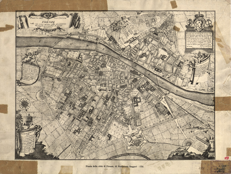 "...NELLE SUE VERE MISURE COLLA DESCRIZIONE DEI LUOGHI PIU' NOTABILI DI CIASCUN QUARTIERE. Pianta topografica di Ferdinando Ruggieri. Riproduzione fotografica annessa allo scritto di Ciullini R., " Di una raccolta di antiche carte e vedute della città di Firenze ", ne " L' universo ", 1924. (Cfr. Mori A. e Boffito G., " Firenze nelle vedute e piante ", 1926, pagg. 78-79)."