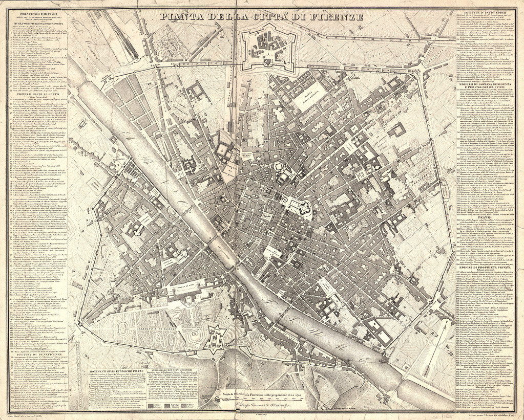 "Rappresentazione orografica a tratteggio. Intorno alla carta l'elenco de "Principali Edifizii, artisti che ne diedero il disegno ed epoca della loro costruzione". Gius. Pozzi dis. e inc., A. Paris imp. Firenze presso l'incisore. Disponibile stampa vedasi A18 catalogo vendite."