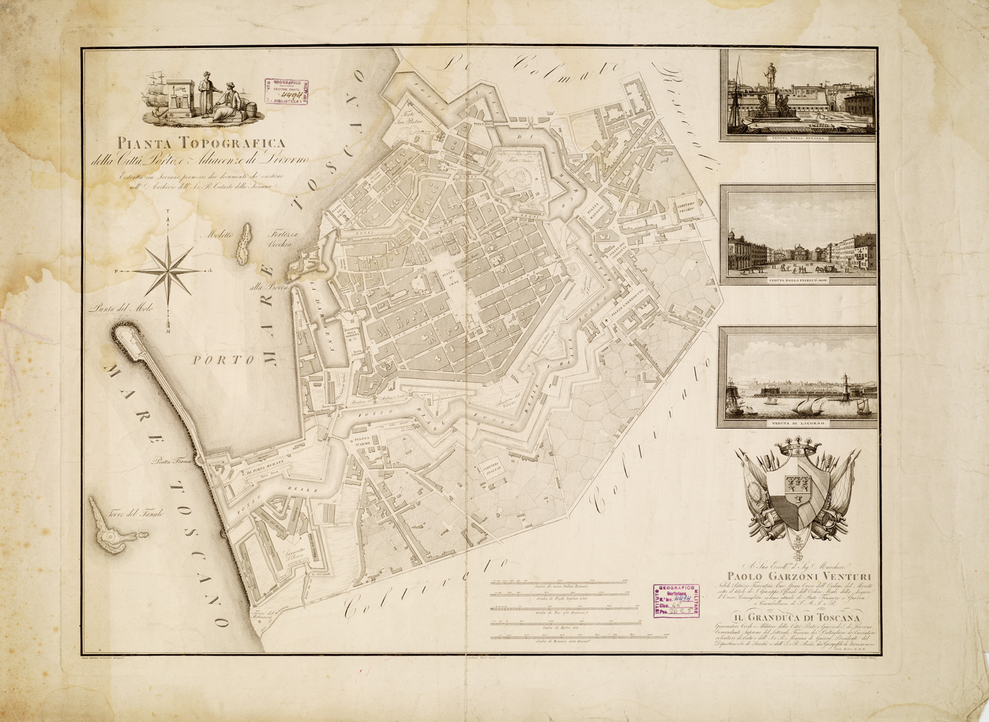 PIANTA TOPOGRAFICA DELLA CITTA' PORTO E ADIACENZE DI LIVORNO ESTRATTO CON SOVRANO PERMESSO DAI DOCUMENTI CHE ESISTONO NELL' ARCHIVIO DELL' I. E R. CATASTO DELLA TOSCANA.