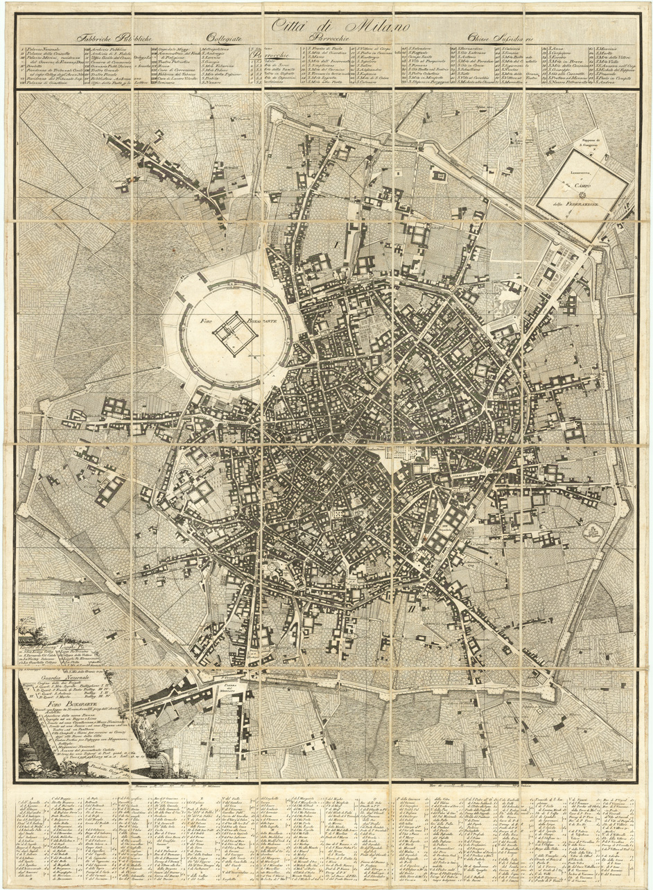 "Pianta incisa su rame montata su tela a stacchi. Manca la graduazione marginale ma sono indicate le coordinate (Long. 26° 51' 15" Isola del Ferro, Lat. 45° 27' 57"). Sono segnati i nomi dei principali edifici e delle strade. La pianta comprende anche parte dell'immediato territorio suburbano indicando strade, abitati, coltivazioni, ecc. E' corredata di un elenco numerico dei principali edifici e dell'elenco delle strade con lettere e numeri rispondenti a quelli segnati lungo i margini per facilitarne la ricerca. Carte analoghe anche alla Collezione Bianconi n. 85 bis e 86. La presente carta e quella alla Collezione n. 85 bis recano la pianta del Foro Bonaparte progettato dall'Architetto Antolini: la carta alla Collezione n. 86 è datata 1808. Cfr. VERGA E., Catalogo Ragionato della Raccolta Cartografica e saggio storico sulla cartografia milanese. Milano, 1911. Pagg. 61-63. Disponibile stampa vedasi A27 catalogo vendite."