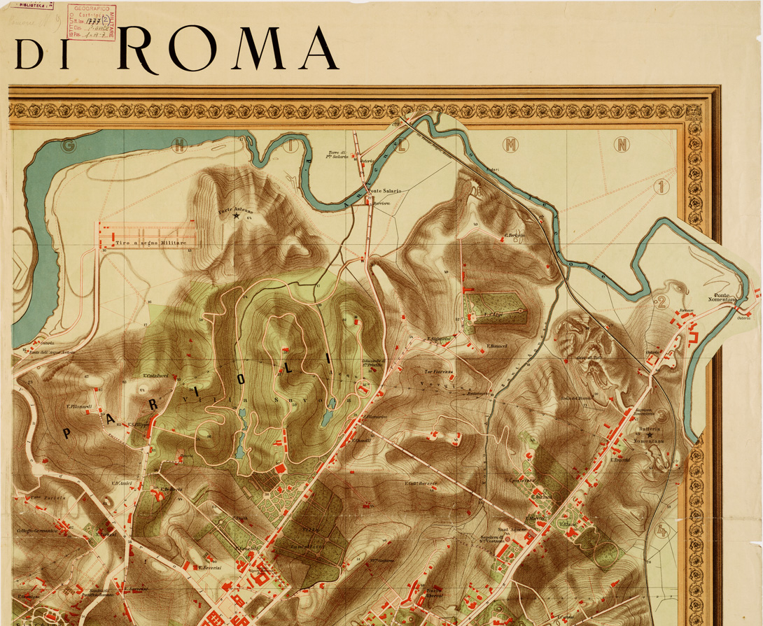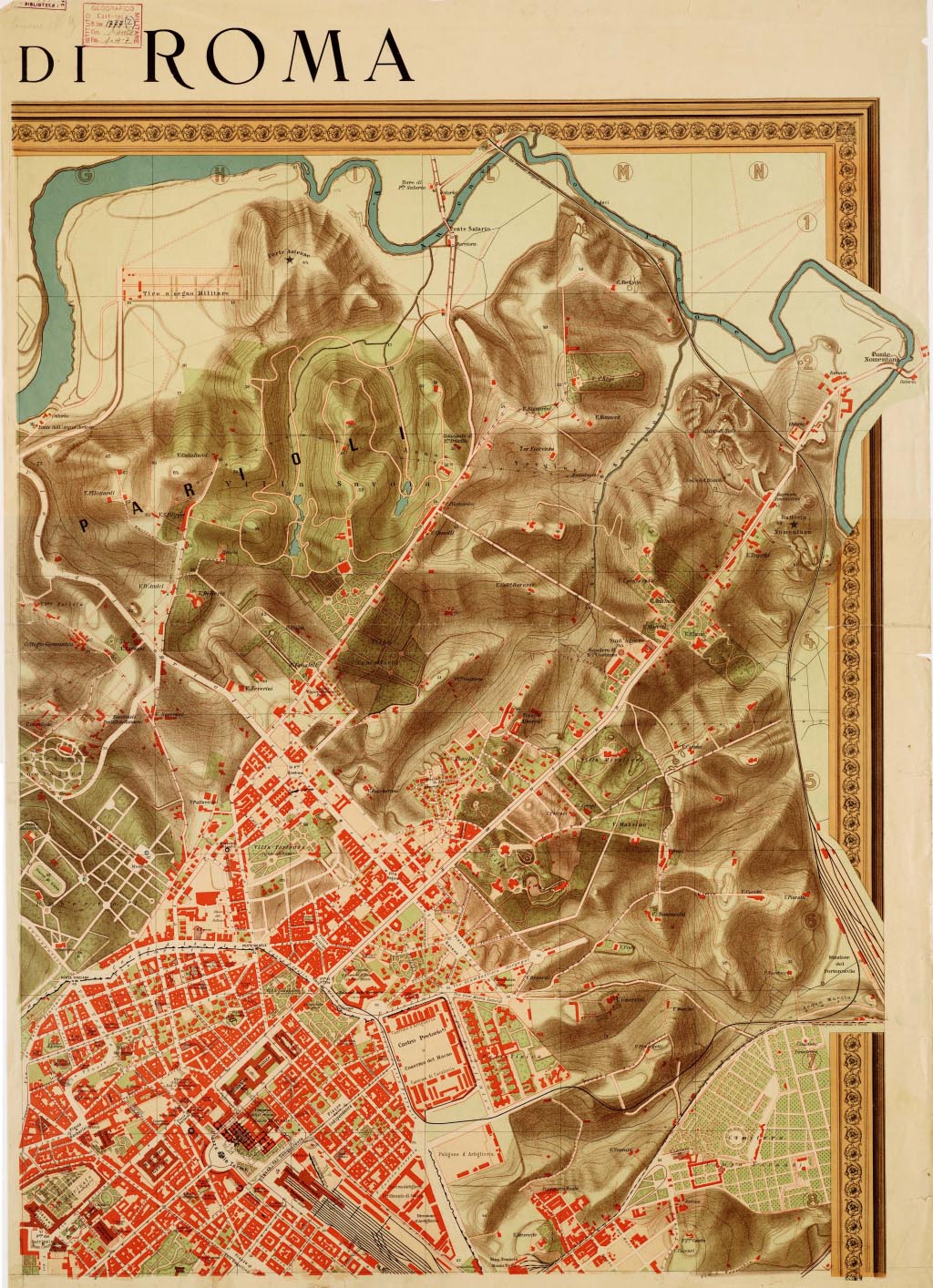 "Carta murale a colori, in quattro fogli disegnati da L. Cardone, sussidiati da cartine complementari della Provincia di Roma (1:500.000) e del Comune di Roma (1:250.000). L'orografia è dimostrata con sfumo e curve di livello in bistro le acque sono in azzurro costruzioni in rosso vegetazioni, giardini, orti, ecc., in verde."