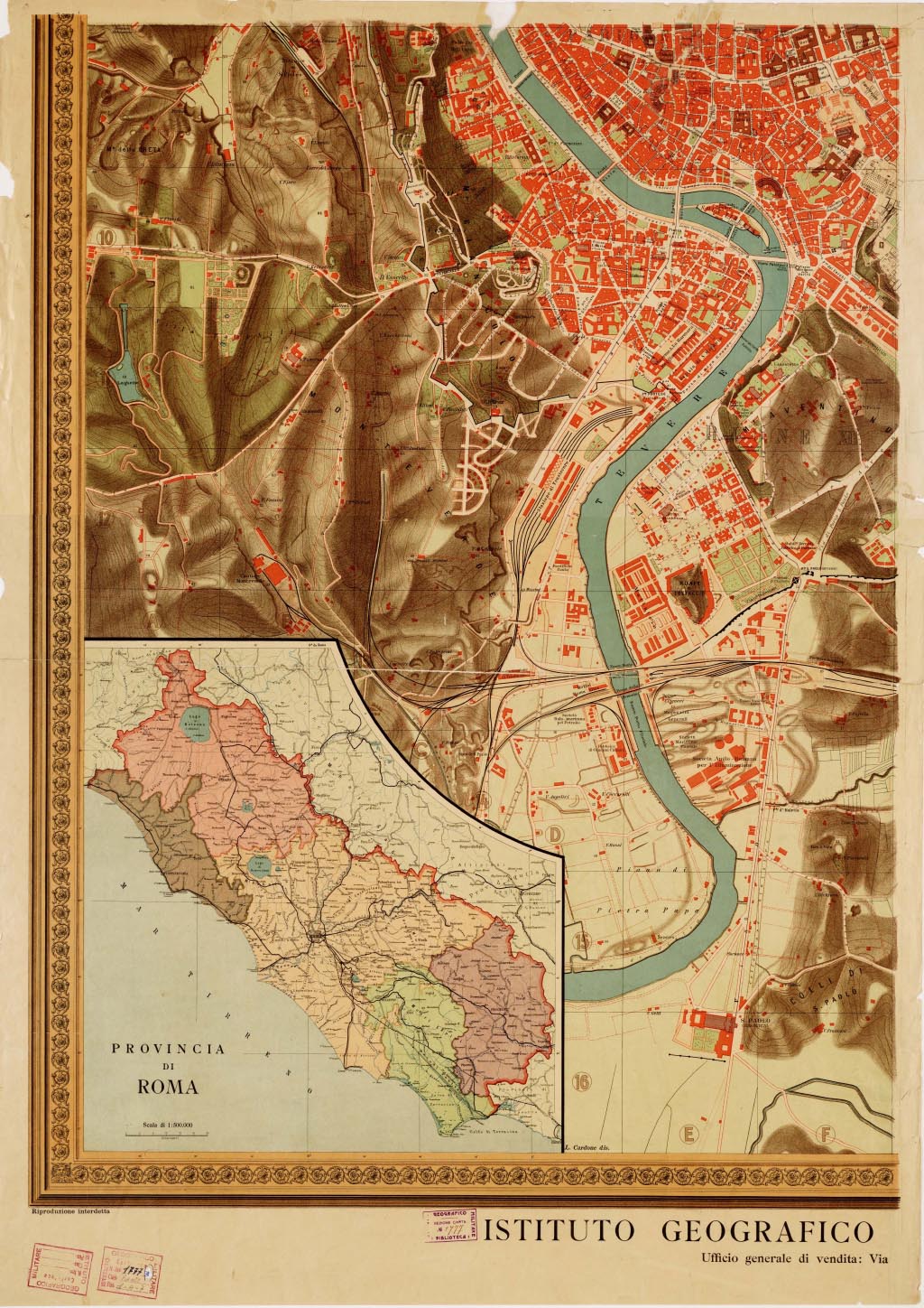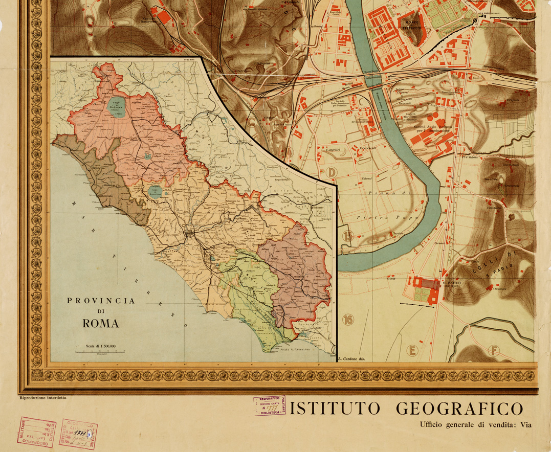 "Carta murale a colori, in quattro fogli disegnati da L. Cardone, sussidiati da cartine complementari della Provincia di Roma (1:500.000) e del Comune di Roma (1:250.000). L'orografia è dimostrata con sfumo e curve di livello in bistro le acque sono in azzurro costruzioni in rosso vegetazioni, giardini, orti, ecc., in verde."