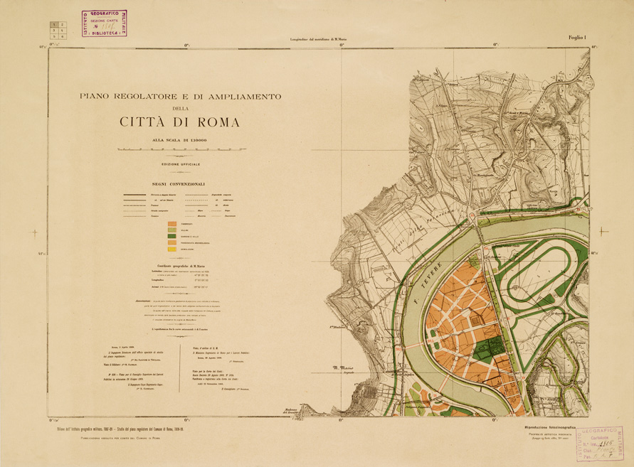 "(ALLA SCALA DI 1:5.000*)EDIZIONE UFFICIALE RILIEVO DELL'I.G.M. 1907-08. STUDIO DEL PIANO REGOLATORE DEL COMUNE DI ROMA, 1908-09. Pubblicazione eseguita per conto del Comune di Roma in cinque fogli. Due copie una delle quali a colori e una in nero mancante del foglio n. 3. Il foglio n. 1 contiene il titolo la leggenda dei segni e dei colori convenzionali. Orografia a curve tracciate alla equidistanza di 1 m. *Il Piano segnato col N° 1805 d'inv. è alla scala di 1:10.000. Cfr. anche la stessa carta ai numeri di Files B0007263-7274 - n. 641 d'Inv. Gen. e n. 1805 - Files B0007143-7148."