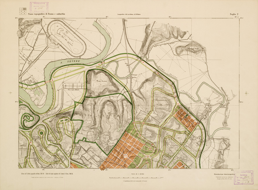 "(ALLA SCALA DI 1:5.000*)EDIZIONE UFFICIALE RILIEVO DELL'I.G.M. 1907-08. STUDIO DEL PIANO REGOLATORE DEL COMUNE DI ROMA, 1908-09. Pubblicazione eseguita per conto del Comune di Roma in cinque fogli. Due copie una delle quali a colori e una in nero mancante del foglio n. 3. Il foglio n. 1 contiene il titolo la leggenda dei segni e dei colori convenzionali. Orografia a curve tracciate alla equidistanza di 1 m. *Il Piano segnato col N° 1805 d'inv. è alla scala di 1:10.000. Cfr. anche la stessa carta ai numeri di Files B0007263-7274 - n. 641 d'Inv. Gen. e n. 1805 - Files B0007143-7148."