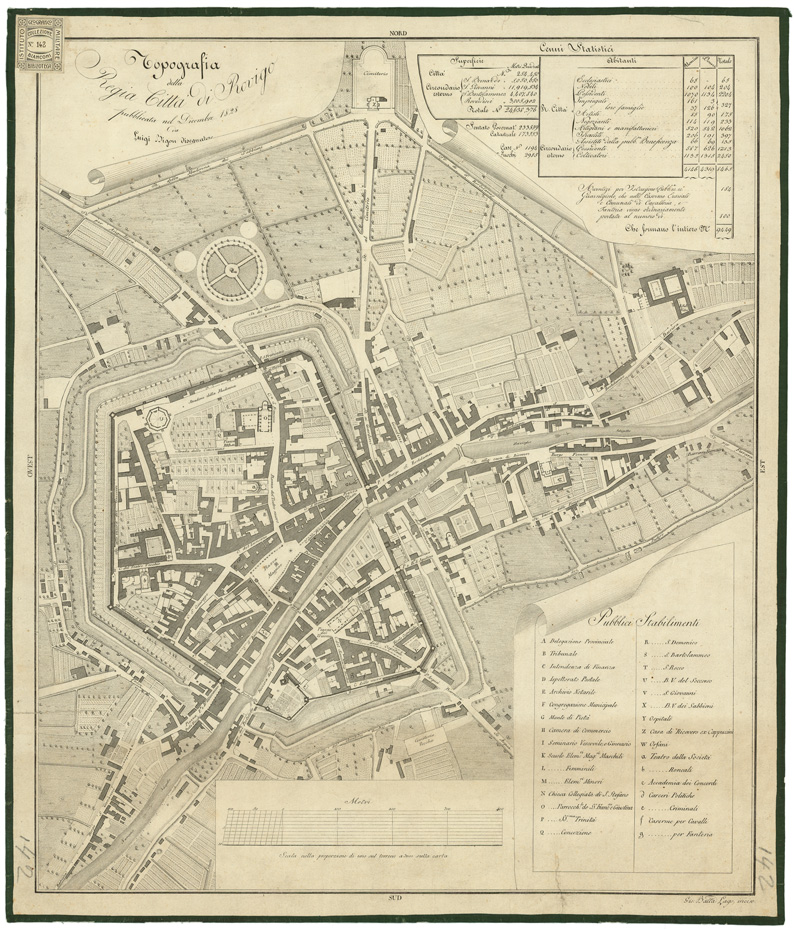 "Pianta incisa su rame. Foglio unico montato su tela. Incisore Gio. Batta Lago. E' corredata di un elenco numerico dei principali edifici e di cenni statistici. Scala grafica in metri."