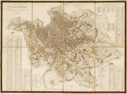 "Cartina incisa su rame. Foglio unico montato su tela a stacchi. Rilievo orografico rappresentato con fine tratteggio. E' sussidiata da elenco numerico delle principali costruzioni, vie, piazze e monumenti antichi. E' dedicata al Cav. Bunsen inviato straordinario e Ministro Plenipotenziario di S.M. il Re di Prussia presso la Santa Sede."