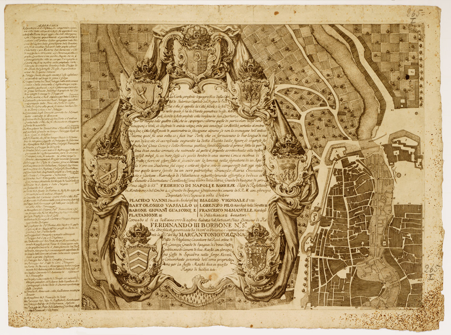 " NICOLAO ANITO REGIO ING.RE DIS.O'. GAROFALO INCISE. Carta in quattro fogli separati, incisi su rame. E' orientata col nord spostato verso sinistra. A sinistra del foglio sud-occidentale la dedica al Senato Palermitano firmata da F. M. Emmanuele e Gaetani Marchese di Villafranca. Attorno al campo disegnato elenco numerico delle costruzioni principali. Dimensioni complessive: cm. 104x79."