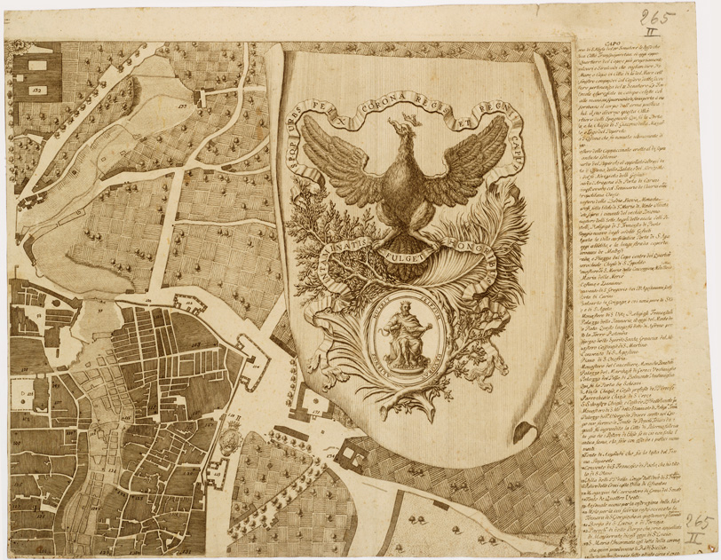 " NICOLAO ANITO REGIO ING.RE DIS.O'. GAROFALO INCISE. Carta in quattro fogli separati, incisi su rame. E' orientata col nord spostato verso sinistra. A sinistra del foglio sud-occidentale la dedica al Senato Palermitano firmata da F. M. Emmanuele e Gaetani Marchese di Villafranca. Attorno al campo disegnato elenco numerico delle costruzioni principali. Dimensioni complessive: cm. 104x79."