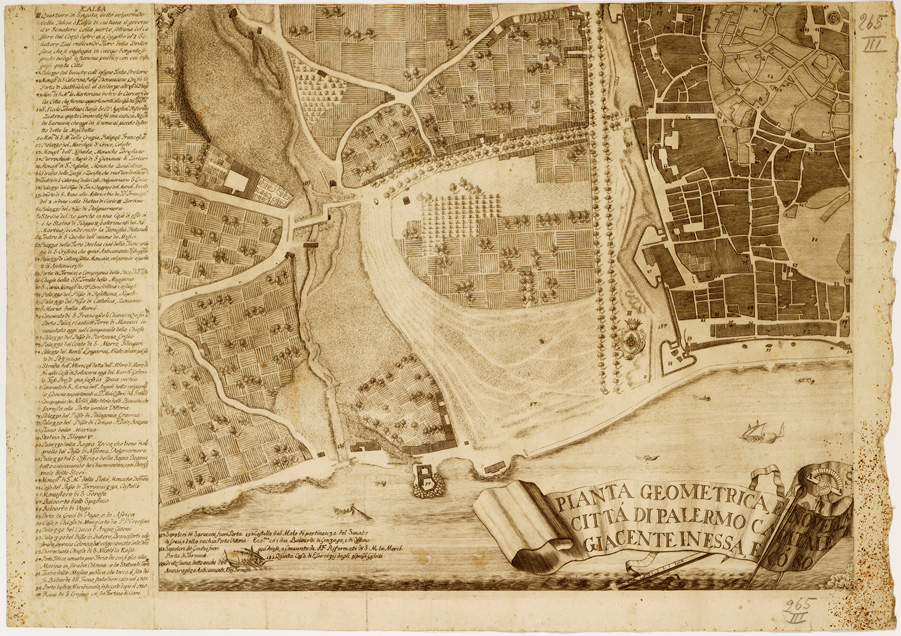"NICOLAO ANITO REGIO ING.RE DIS.O'. GAROFALO INCISE. Carta in quattro fogli separati, incisi su rame. E' orientata col nord spostato verso sinistra. A sinistra del foglio sud-occidentale la dedica al Senato Palermitano firmata da F. M. Emmanuele e Gaetani Marchese di Villafranca. Attorno al campo disegnato elenco numerico delle costruzioni principali. Dimensioni complessive: cm. 104x79."
