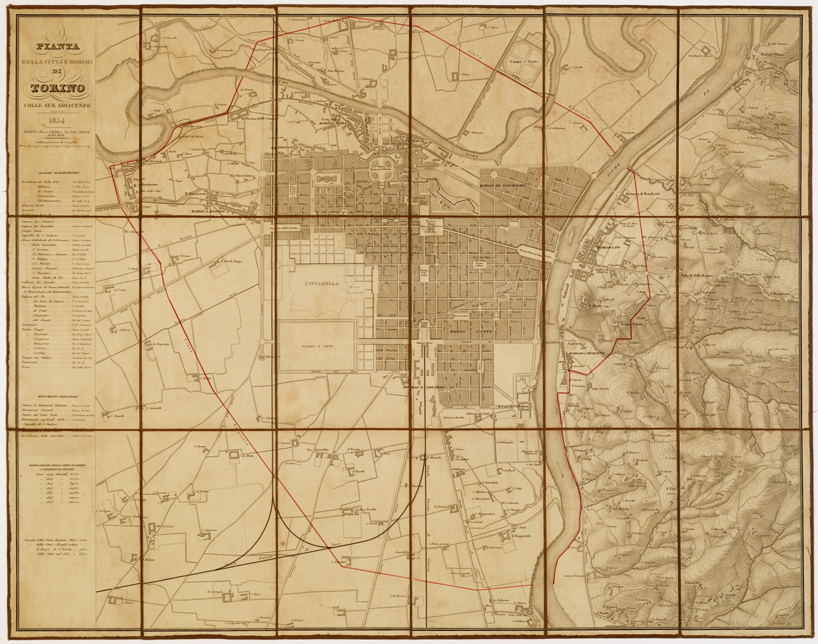 PIANTA DELLA CITTA' E BORGHI DI TORINO COLLE SUE ADIACENZE V. ANGELI DIS. INC. TORINO, PRESSO L'EDIT. GIO BATTA MAGGI