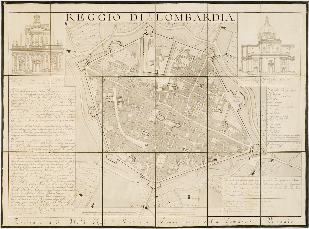 "Pianta di Reggio Emilia in foglio unico, costruita da L. Manzotti, incisa da A. Gajani nel 1817, sotto la direzione di Venturi. Posizione geografica calcolata dall' Ing. Mil. G. Carandini. E' corredata di notizie generali della città, dell'elenco numerico delle Chiese principali e di due prospetti di Chiese disegnati da G. Marchelli. Scale grafiche in braccia reggiane e in metri."