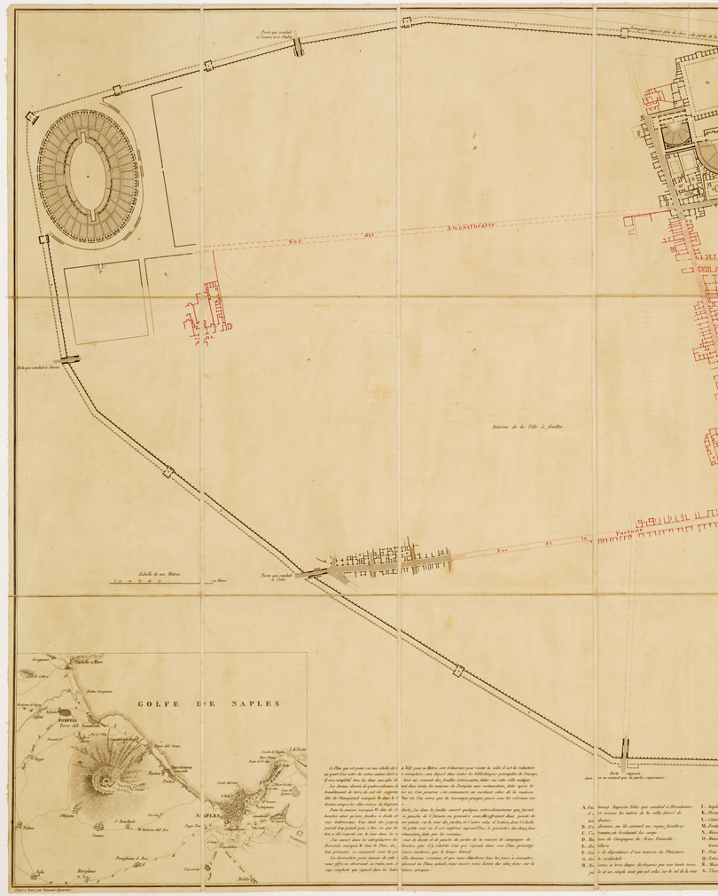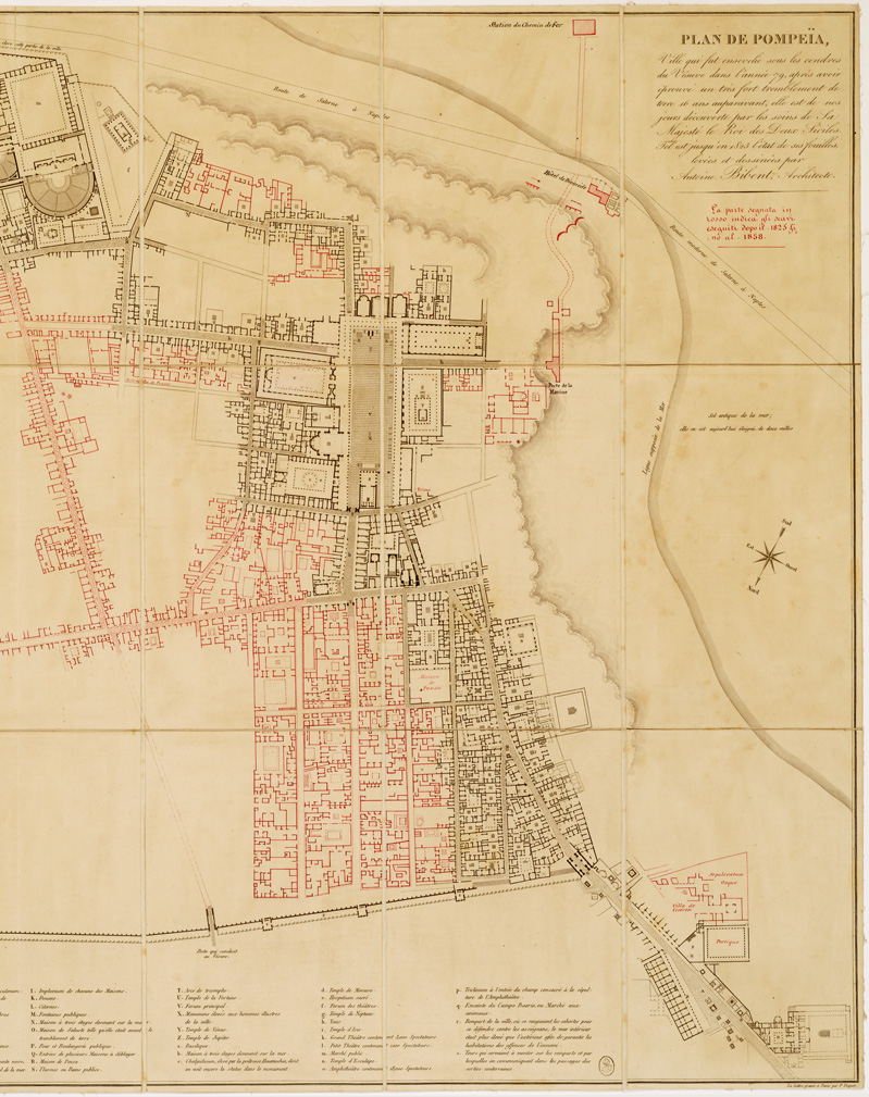 "TEL EST JUSQU'EN 1825 L'ETAT DE SES FOUILLES LEVEES ET DESSINEES PAR ANTOINE BIBENT, ARCHITECTE. Incisione su pietra litografica eseguita a Roma da Giovanni Aquaroni. Scritture incise a Parigi da P. Piquet. Stampa in nero con aggiunte in rosso manoscritte per gli scavi eseguiti dal 1825 al 1858. In basso cartina del Golfo di Napoli, notizie sulla costruzione della carta ed elenco numerico delle costruzioni rimesse in luce. La pianta è orientata col nord volto al basso del foglio."