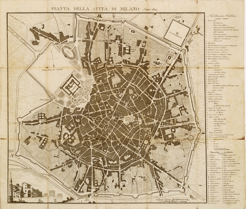 "Un foglio stampato in nero montato su tela, contenuto in busta. V'è inserito l'elenco numerico dei principali edifici. Scale grafiche in braccia milanesi e in metri. Senza indicazione di autore, incisore o stampatore."