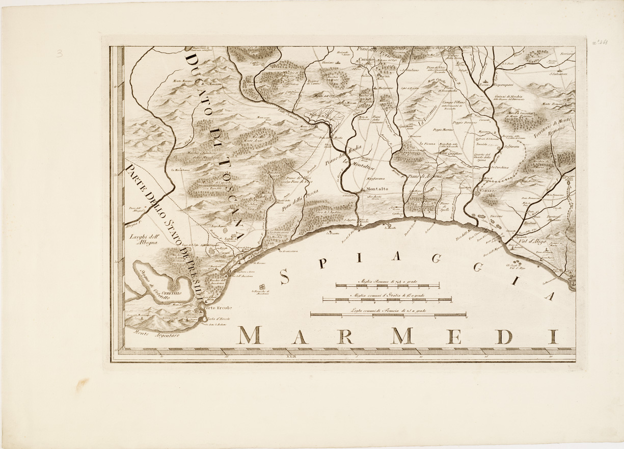 "Quattro fogli incisi su rame. Orientazione: il nord è spostato a sinistra. Orografia prospettica a monticelli. Abitati principali rappresentati in pianta gli altri in prospettiva. Sono tracciate le strade. Sono indicate le vegetazioni. Il foglio nord orientale contiene la dedica a Pio VI firmata da Giuseppe Morozzo Limiti: nord, Orvieto sud, Mare Mediterraneo ovest, Rocca Albegna est, Roma. Manca il foglio sud occidentale. La copia d'Archivio è completa in quattro fogli riuniti e montati su tela, delle dimensioni complessive di m. 0,76x1,11."